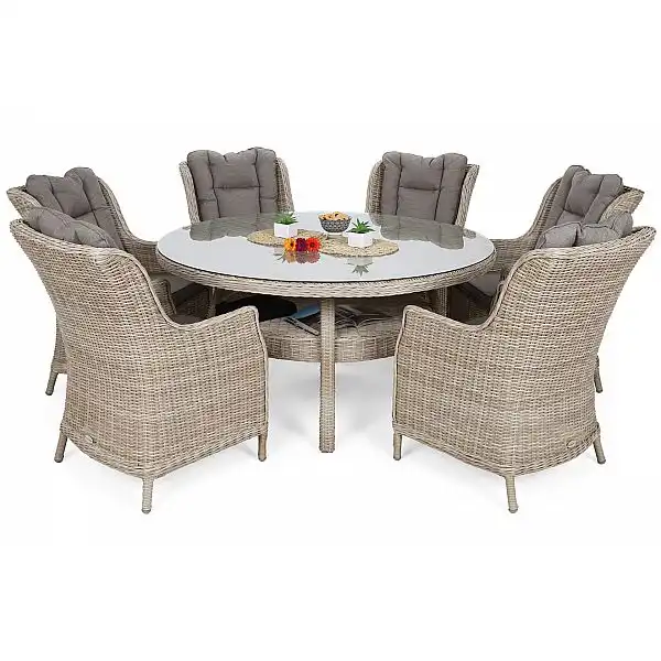 Bristol Round Elegant 150 см – отличный вариант для тех, кто ищет комплект садовой мебели чуть более компактного размера. В комплект входят шесть удобных кресел, мягкие подушки и элегантный столик. Набор изготовлен из комбинации техноротанга и алюминия с порошковым покрытием, что гарантирует его долговечность и прослужит своему владельцу долгие годы. Стеклянная столешница придает сервизу современный и универсальный вид.