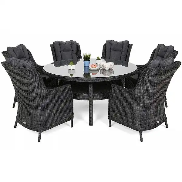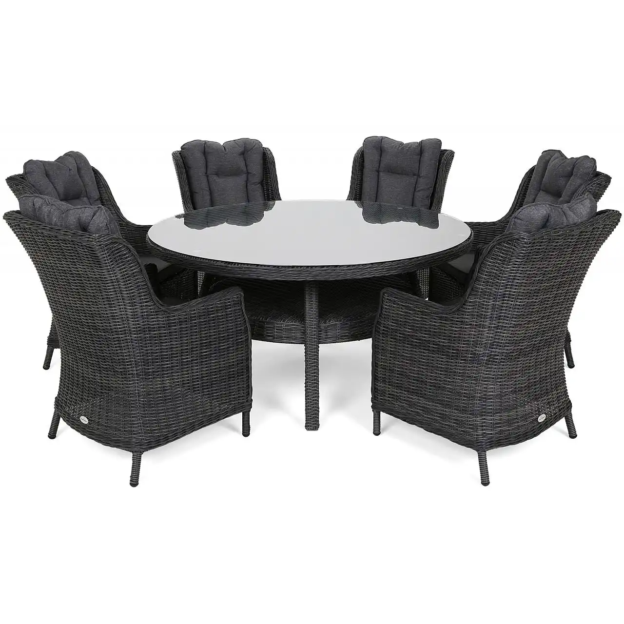 Bristol Round Elegant 150 см – отличный вариант для тех, кто ищет комплект садовой мебели чуть более компактного размера. В комплект входят шесть удобных кресел, мягкие подушки и элегантный столик. Набор изготовлен из комбинации техноротанга и алюминия с порошковым покрытием, что гарантирует его долговечность и прослужит своему владельцу долгие годы. Стеклянная столешница придает сервизу современный и универсальный вид.