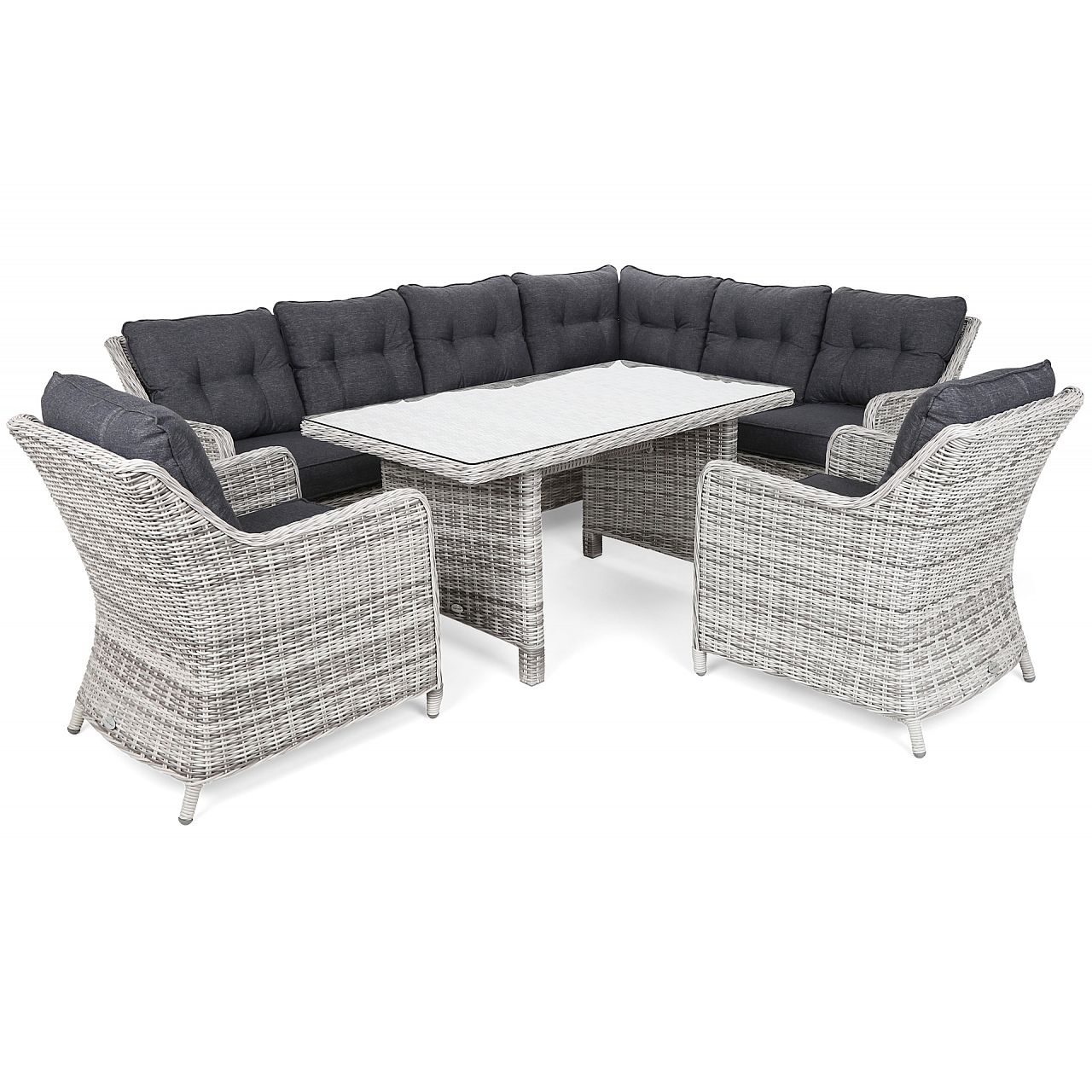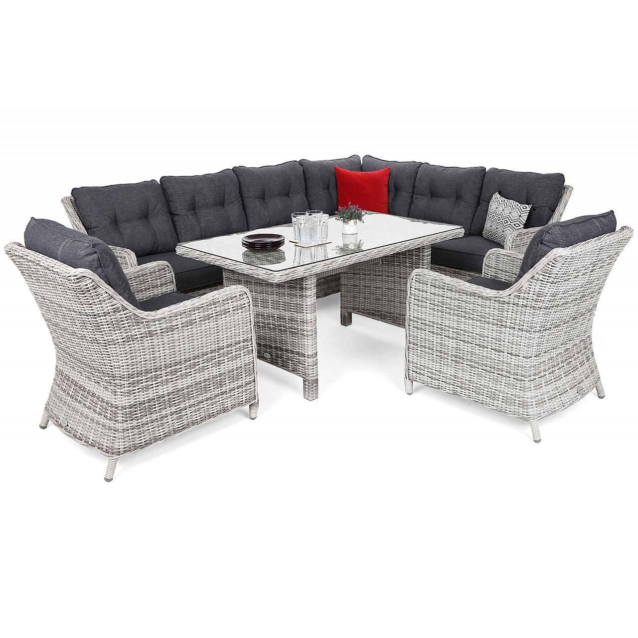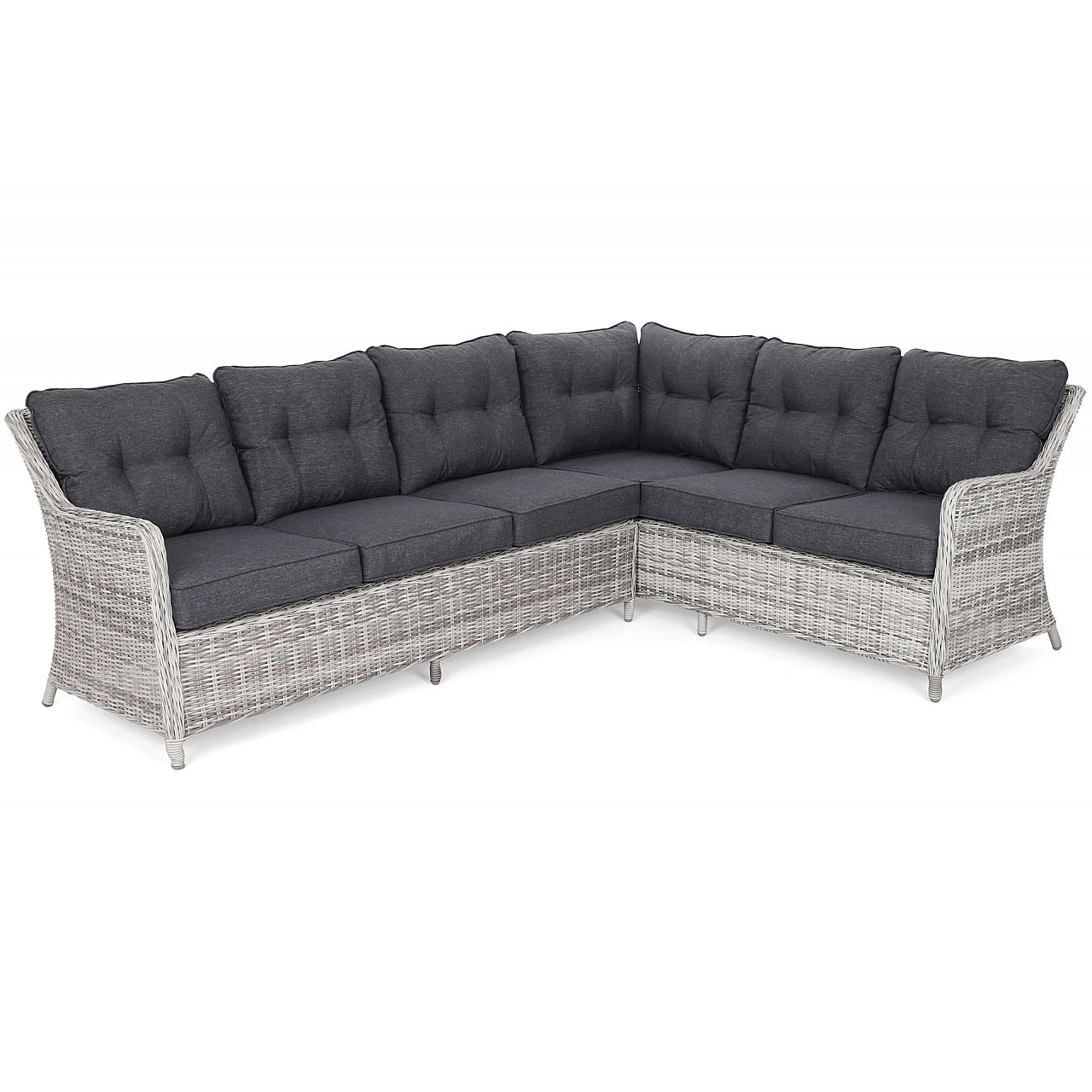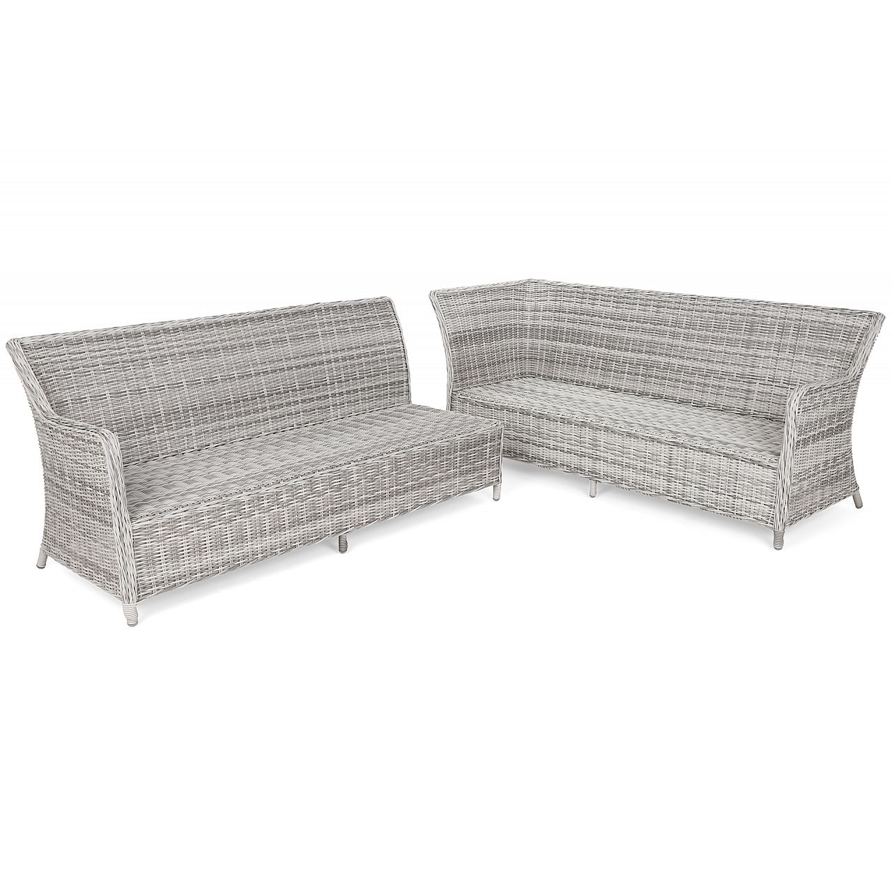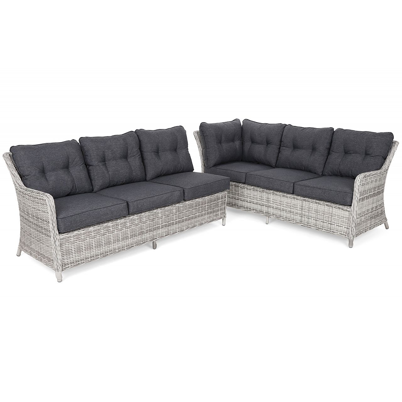 Угловая садовая мебель «Калифорния» — это комплект для отдыха, в котором может разместиться довольно большая семья или группа друзей: в нем могут разместиться до 8 человек . Комплект состоит из 2-х диванов, образующих угловой диван (их можно использовать и отдельно), 2-х кресел и стола. Прочная, но легкая алюминиевая рама дополнительно покрыта порошковой краской. Конструкция покрыта техноротангом ручной работы с плетеной фактурой - виден нежный «пушок» (заметен и на ощупь), благодаря чему мебель выглядит очень естественно и тепло. Комфорт этого углового комплекта из техноротанга обеспечивается толстыми подушками, расположенными на сиденьях, а также набивкой спинок обоих сегментов углового дивана. Подушки покрыты материалом типа Hamilton и оснащены молниями. Поэтому их можно легко снять и очистить. Также заслуживает внимания почти полноразмерный стол со стеклянной столешницей. Выглядит все это чрезвычайно элегантно – угловой гарнитур «Калифорния» – предложение для людей с утонченным вкусом, которые любят проводить время большими компаниями на террасе своего дома.