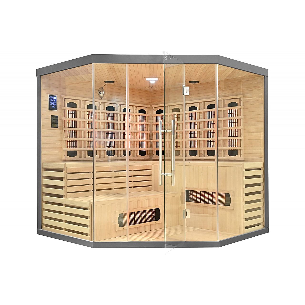 Инфракрасная сауна (инфракрасная, низкотемпературная) без пара и с низкой температурой воздуха (до 60°С), где вместо традиционных печей используются кварцевые, керамические или угольные инфракрасные обогреватели. Кабину из канадской ели можно установить в ванной, спальне, гостиной или любой другой комнате. Для работы достаточно обычного источника питания 230В. После включения сауна имеет заводскую настройку на 60 минут. Она оснащена автоматическим выключателем, который предотвращает случайное оставление сауны включенной на слишком долгое время, что делает ее использование безопасным. Радиаторы защищены деревянными решетками.