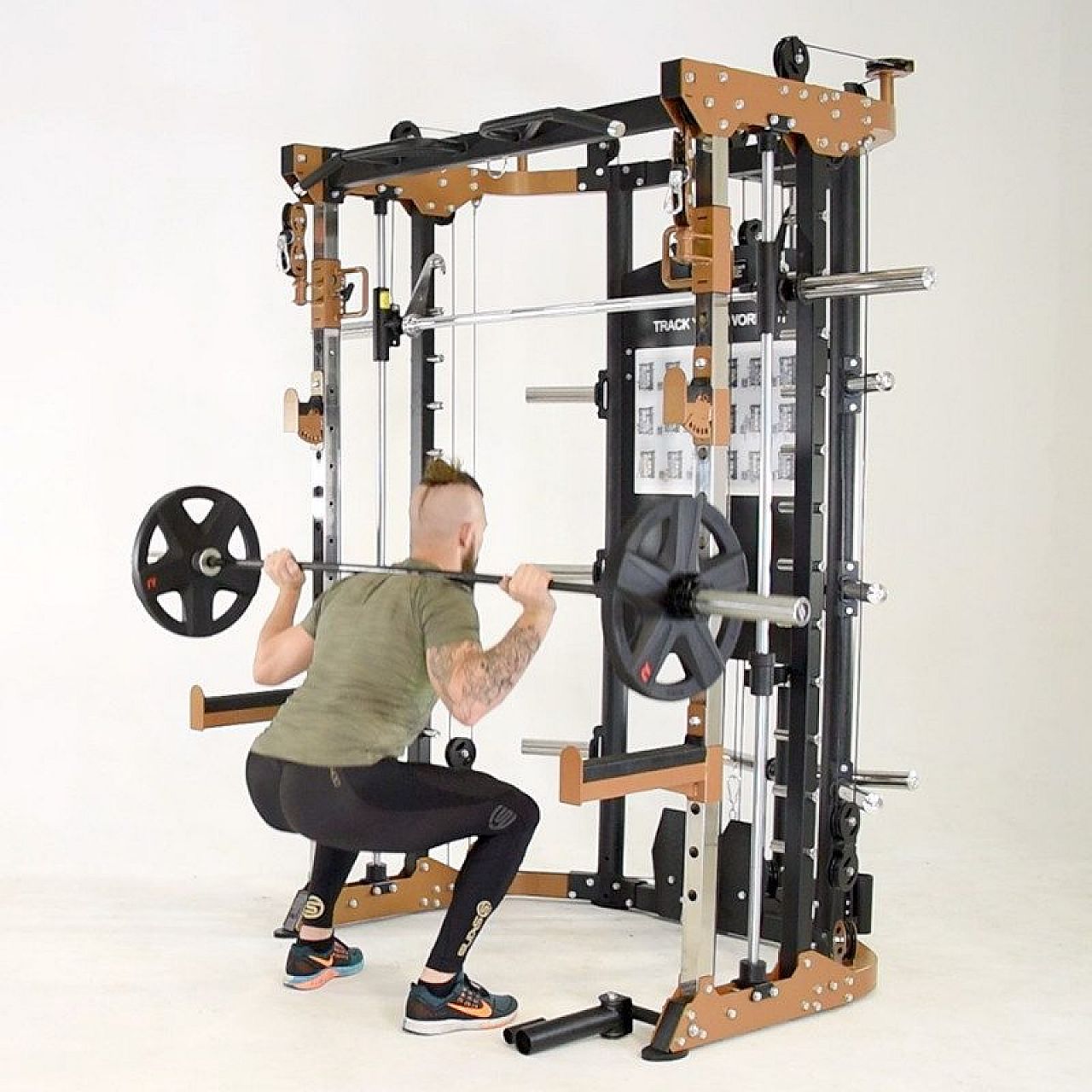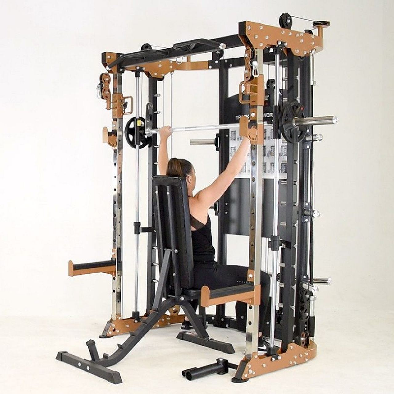 Компактный размер: со всеми надстройками и функциями упражнений она имеет 1350 (Ш) x 1700 (Д) x 2200 (В) мм. Обеспечьте дополнительную ширину для машины Смита и олимпийского грифа.