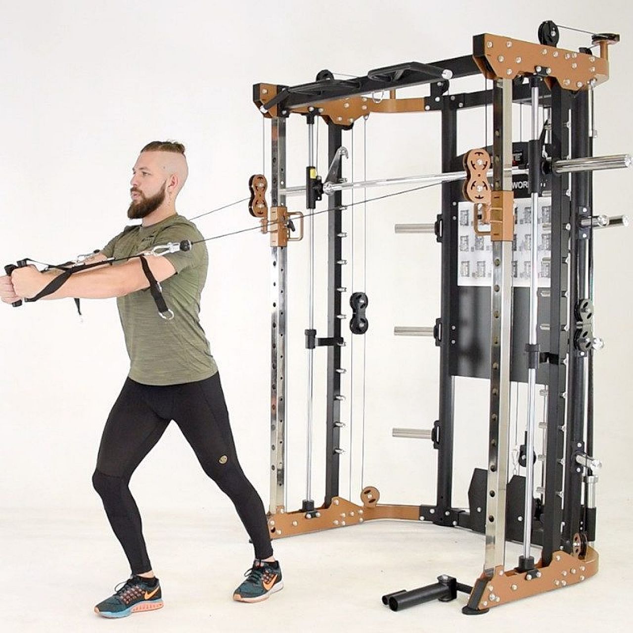 Перекрестная кабельная система: имеет систему свободно движущихся весов, способную удерживать олимпийские или обычные диски. Кабели представляют собой коммерческий авиационный кабель (номинальная мощность 907 кг) и оснащены высококачественными коммерческими герметичными подшипниковыми шкивами для бесшумного плавного движения и поворота на 270 градусов. Также в комплект входят 2 ручки для тяги.