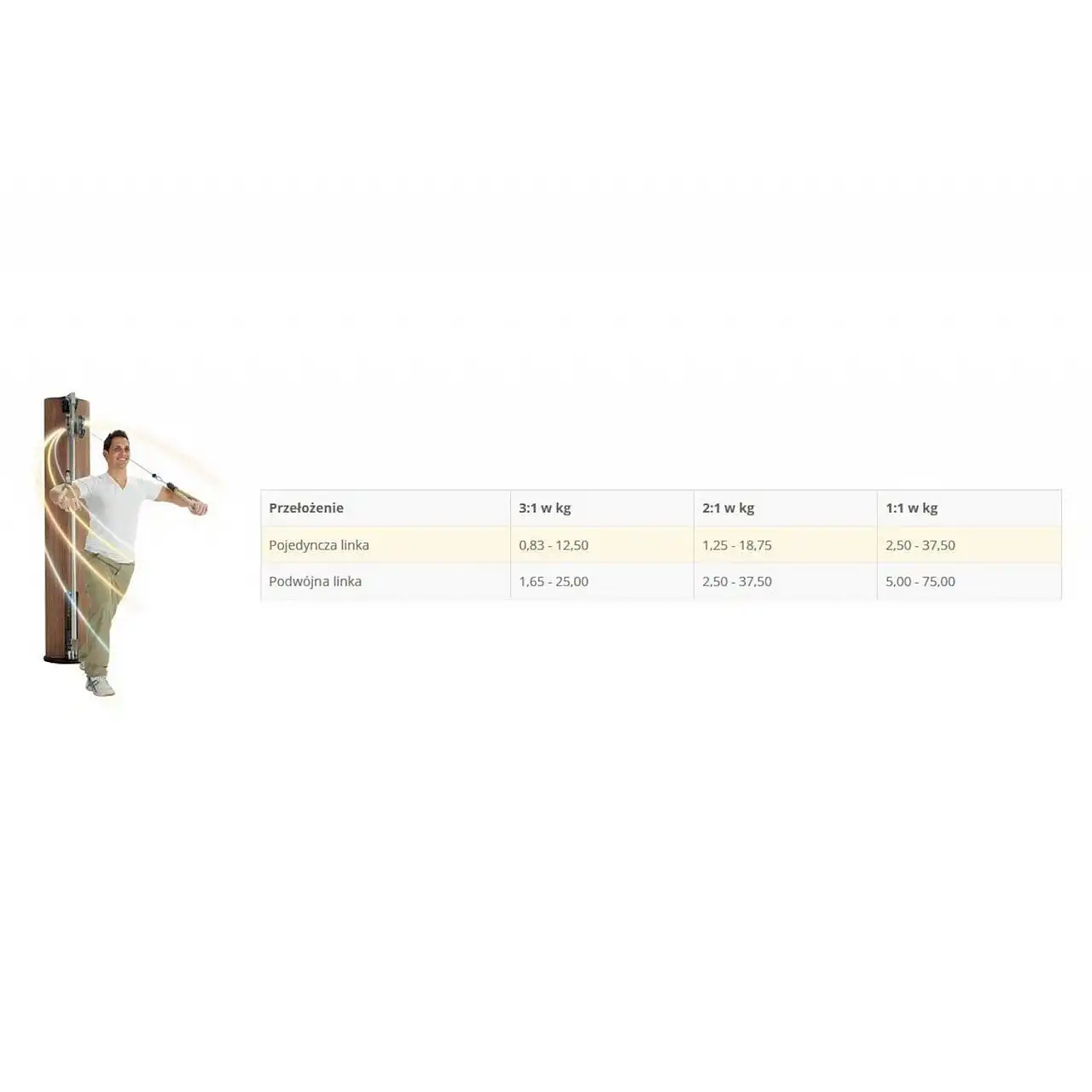 Передаточное число можно изменять с помощью кабеля SlimBeam. Это позволяет получить передаточные числа 3:1, 2:1 и 1:1. Эффективный максимальный вес 12,5 кг (одинарная тяга) или 25,0 кг (двойная тяга), распределенная между 15 грузами, обеспечивает очень точную и гармоничную градацию веса. Соотношение 3:1 в стандартной комплектации.