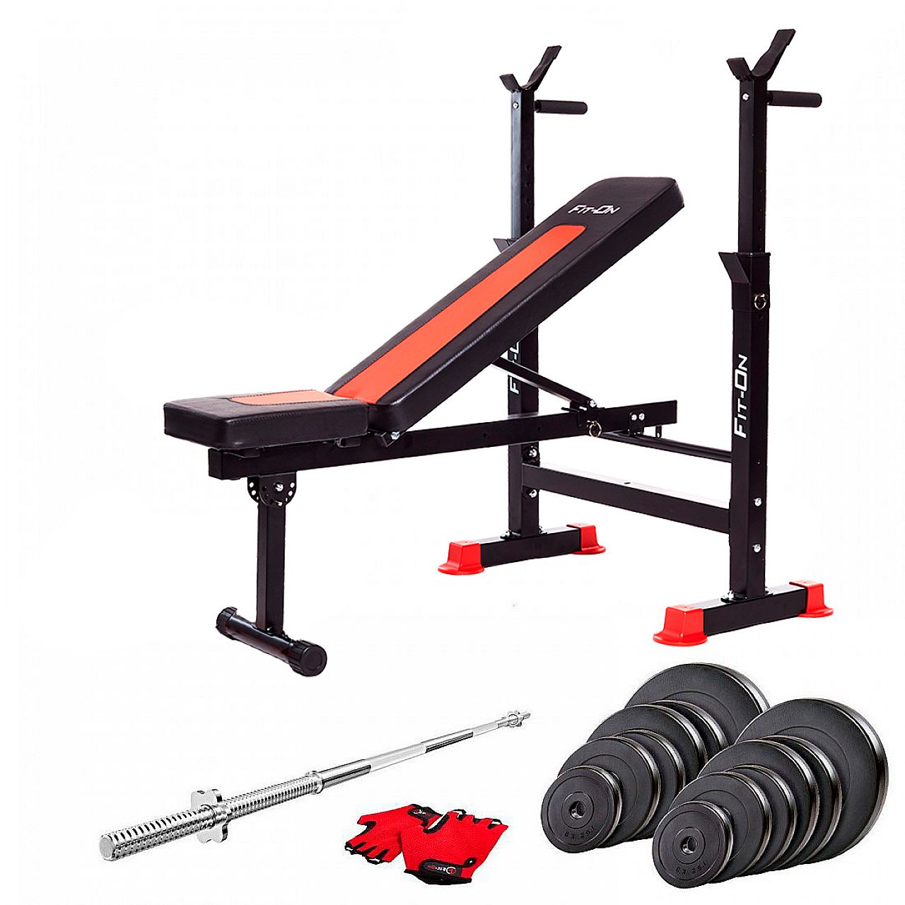 Мы предлагаем первоклассное оборудование – корпус наших дисков сделан из прочного пластика (благодаря которому они в случае падения не повредят пол, плитку и т. д.), А длинный гриф длиной 180 см, устойчив до самых высоких нагрузок. Дополнительно в комплект входит массивная тренировочная скамья Fit-On FN-S101 для жима штанги с эспандерами.