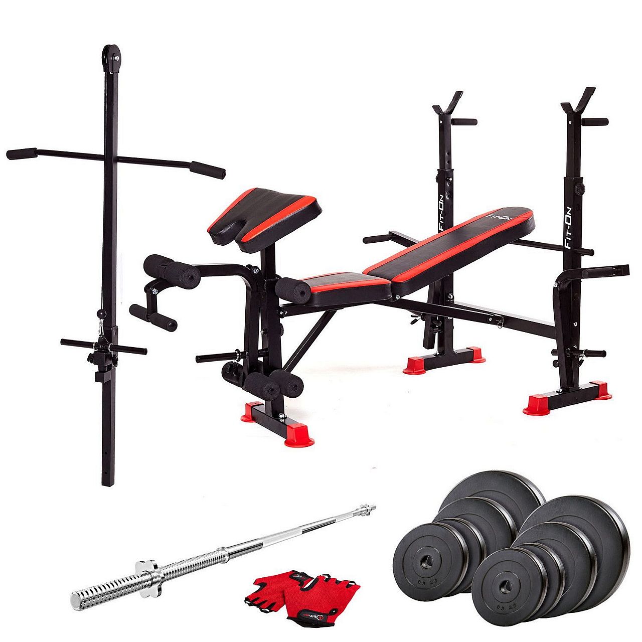 Мы предлагаем первоклассное оборудование – корпус наших дисков сделан из прочного пластика (благодаря которому они в случае падения не повредят пол, плитку и т. д.), А длинный гриф длиной 180 см, устойчив до самых высоких нагрузок. Дополнительно в комплект входит массивная тренировочная скамья Fit-On FN-S102 с тягой, партой скотта и приставкой для тренировки мышц ног.
