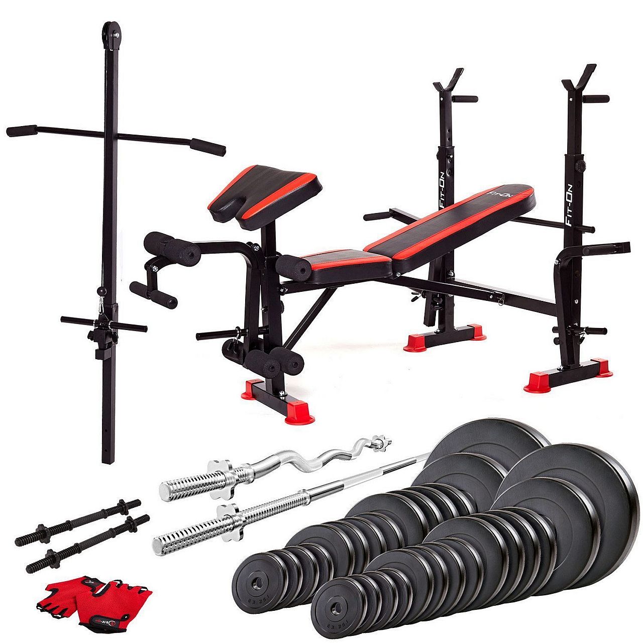Мы предлагаем первоклассное оборудование – корпус наших дисков сделан из прочного пластика (благодаря которому они в случае падения не повредят пол, плитку и т. д.), А длинный гриф длиной 180 см, устойчив до самых высоких нагрузок. Дополнительно в комплект входит массивная тренировочная скамья Fit-On FN-S102 с тягой, партой скотта и приставкой для тренировки мышц ног.