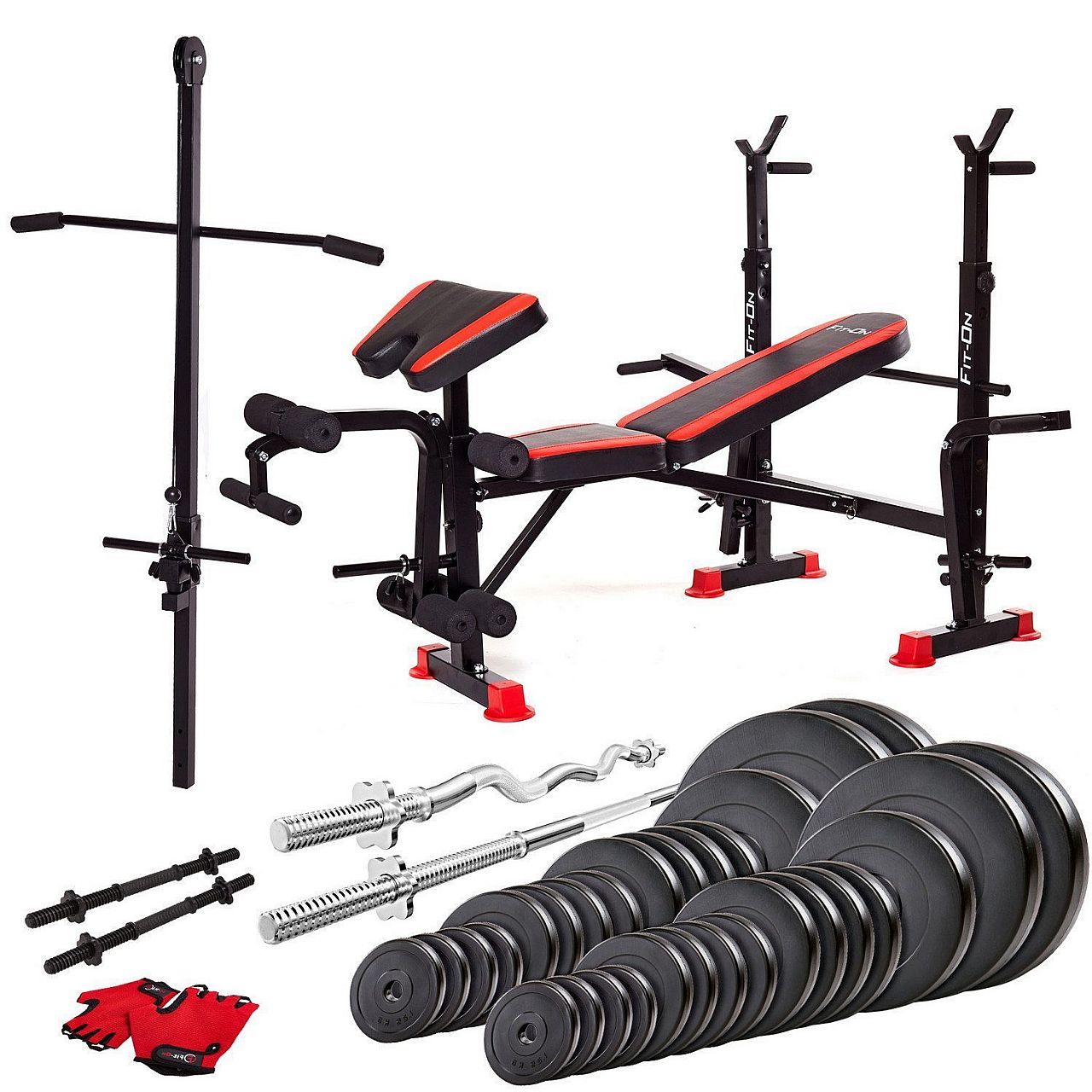 Мы предлагаем первоклассное оборудование – корпус наших дисков сделан из прочного пластика (благодаря которому они в случае падения не повредят пол, плитку и т. д.), А длинный гриф длиной 180 см, устойчив до самых высоких нагрузок. Дополнительно в комплект входит массивная тренировочная скамья Fit-On FN-S102 с тягой, партой скотта и приставкой для тренировки мышц ног.