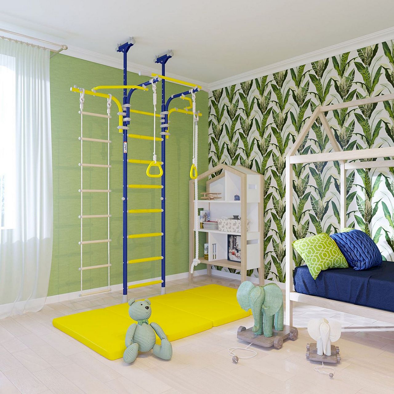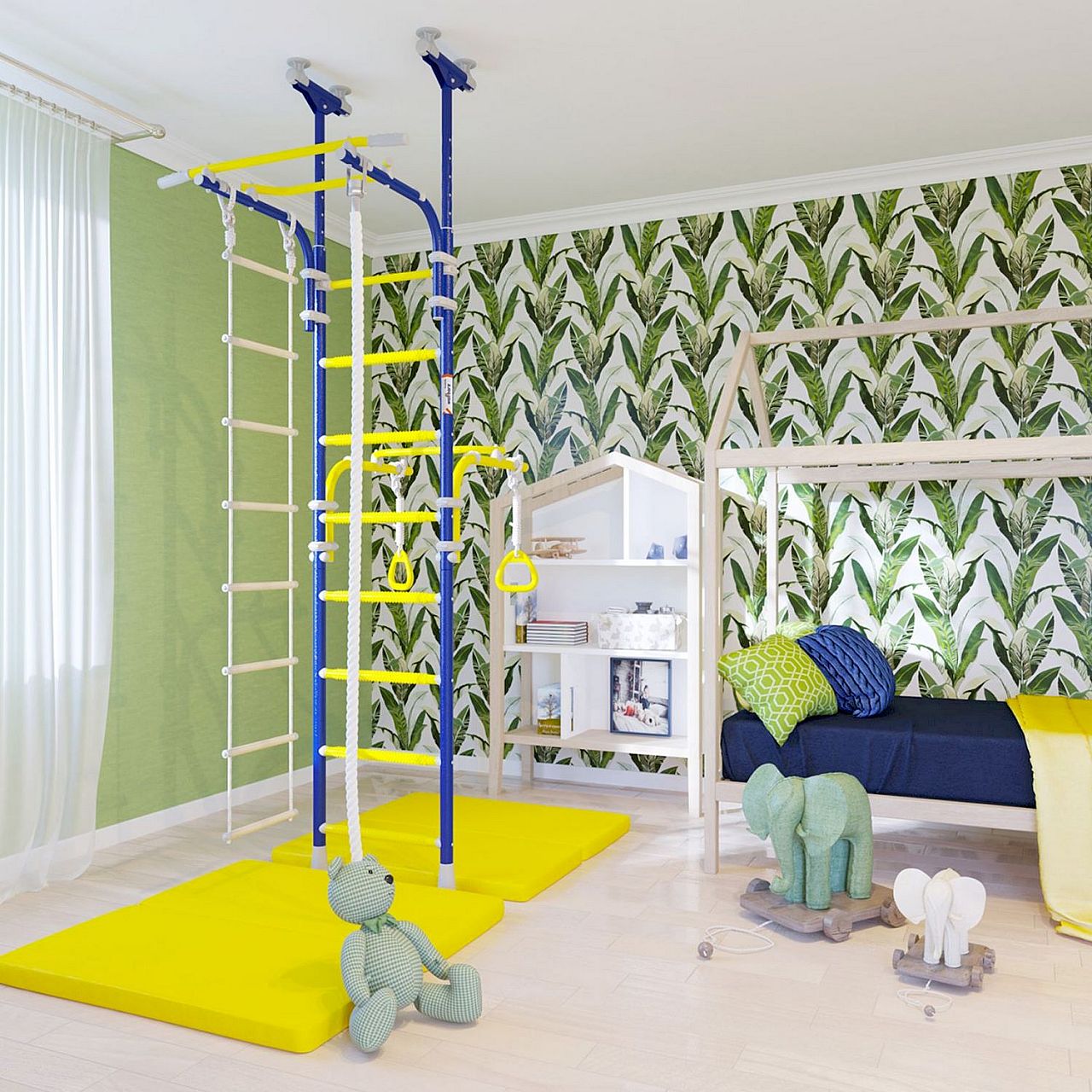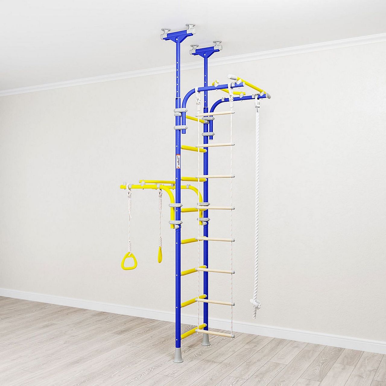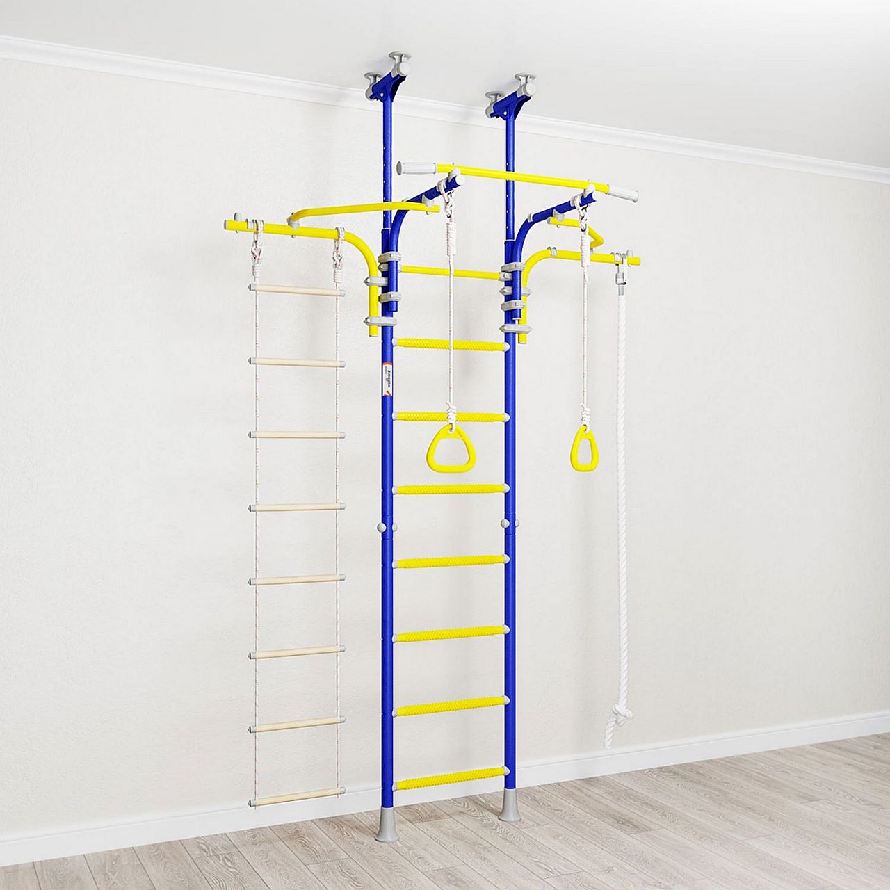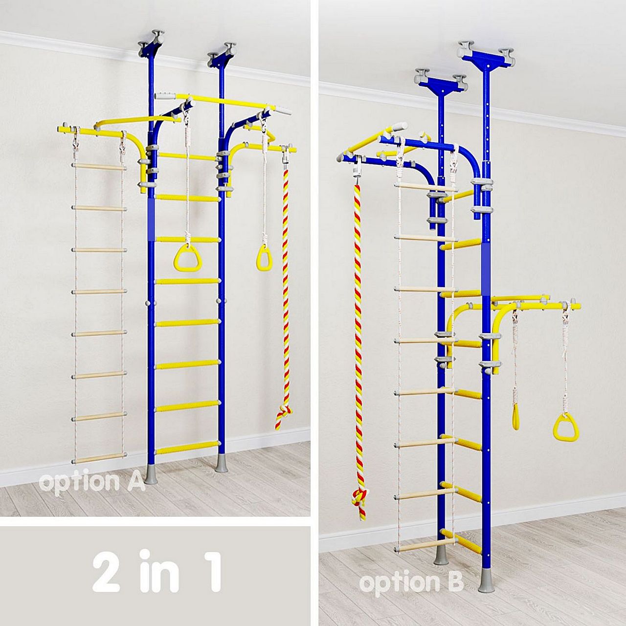 Wielofunkcyjny zestaw do zabawy, wspinaczki i ćwiczeń fizycznych. Це nowoczesny kompleks sportowy, zaprojektowany z myślą o różnorodnej aktywności dziecka, але także dorosłych. To doskonały i skuteczny sposób, щоб skłonić dziecko do aktywności fizycznej w trakcie przebywania w domu. WALLBARZ Family Transformer 7D wyposażony jest drabinkę, drabinkę linową, drążek poziomy regulowany, line spinaczkową i kółka gimnastyczne. Wysokość regulowanego drążka można zmieniać w miarę dorastania dziecka. Dzięki temu ćwiczenia są bardziej komfortowe, dopasowane do wieku i rozwoju dziecka, a тим samym bezpieczne. Co наjistotniejsze w them modelu, poza standardowymi funkcjami, WALLBARZ Transformer 7D umożliwia umieszczenie dwóch komponentów (liny i drabiny linowej) w różnych miejscach. Tim samym to produkt 2w1, ktory możemy dostosować do naszych oczekiwań. Dużym atutem zestawu jest także skutocnost, że не zajmuje на wiele miejsca w pomieszczeniu, тим самим можна go zamontować w prawie każdym mieszkaniu. Zestaw przymocowany jest do podłogi і sufitu.