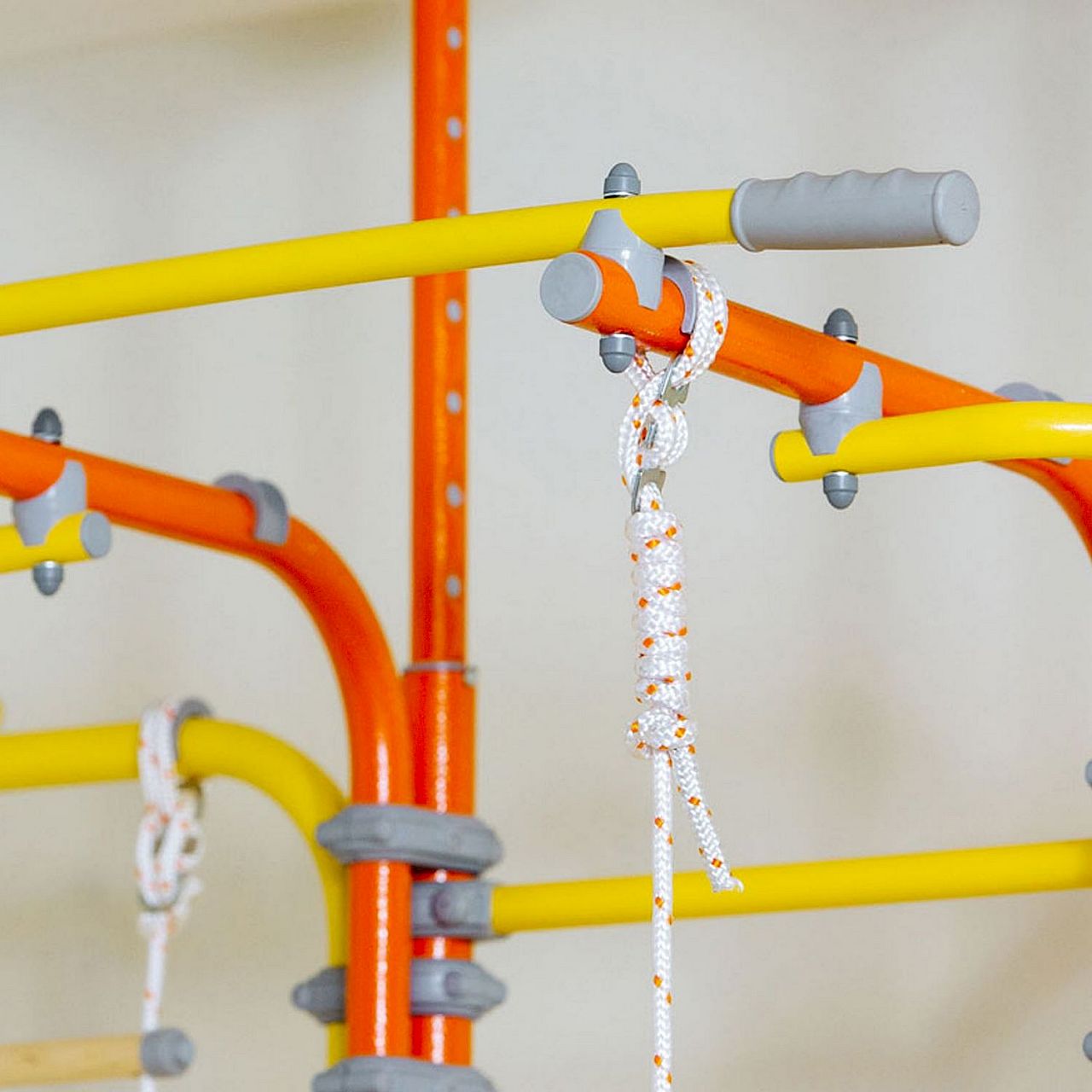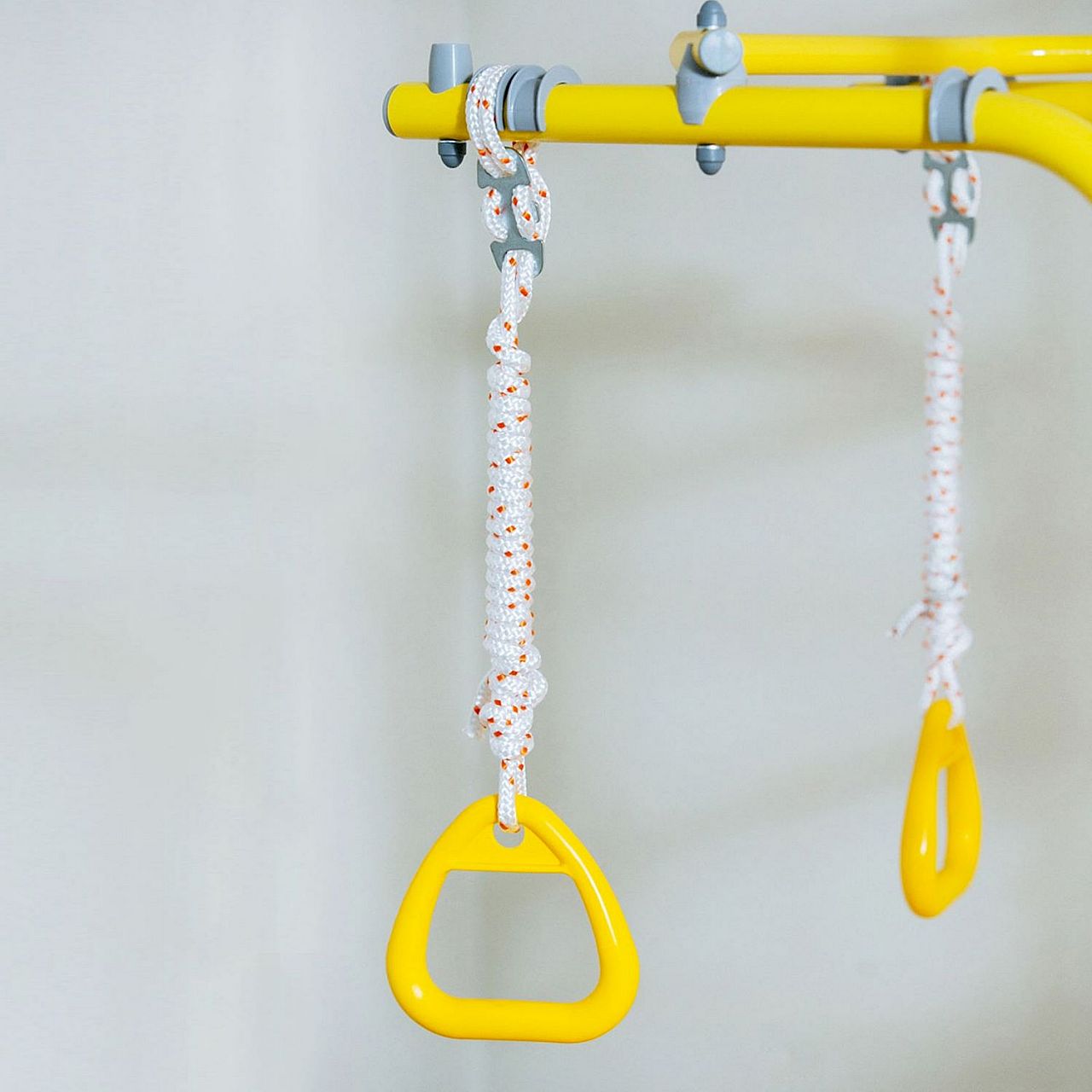 • Akcesoria : 8-stopniowa drabinka ścienna, drabinka linowa, drążek poziomy z regulacją wysokości, lina wspinaczkowa, 2 kółka gimnastyczne. Wysokość regulowana indywidualnie za pomocą uchwytów na linach