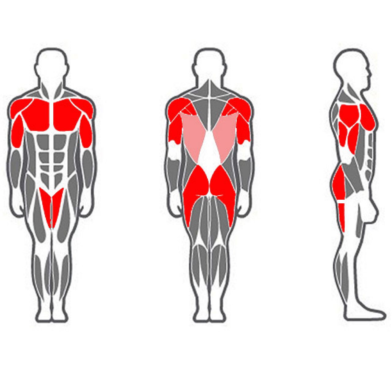 М'язи: біцепс, трицепс, дельти, м'язи грудей, м'язи спини, прес, що відводять і приводять м'язи стегна, двоголовий м'яз стегна, сідниці.