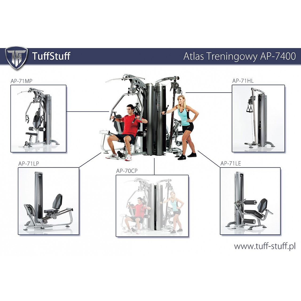 Мультистанція Tuff Stuff AP-7400 – професійний багатофункціональний пристрій із чотирма станціями для інтенсивних вправ у домашніх умовах та у тренажерному залі. Найбільшою її перевагою є можливість одночасного тренування для чотирьох осіб . Tuff Stuff AP-7400 дозволяє безпечно тренувати різні групи м'язів. Це ідеальне рішення як для жінок, так і для чоловіків, які хочуть покращити загальний стан, покращити зовнішній вигляд фігури, збільшити та зміцнити м'язову масу. Мультистанція AP-7400 дозволяє формувати всі групи м'язів: найширшу спину, груди, сідниці, передпліччя, трицепс, дельтоподібні, трапецієподібні, постуральні, а також дозволяє тренувати ноги в положенні сидячи та стоячи.