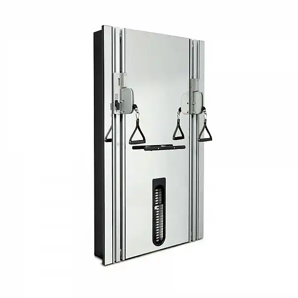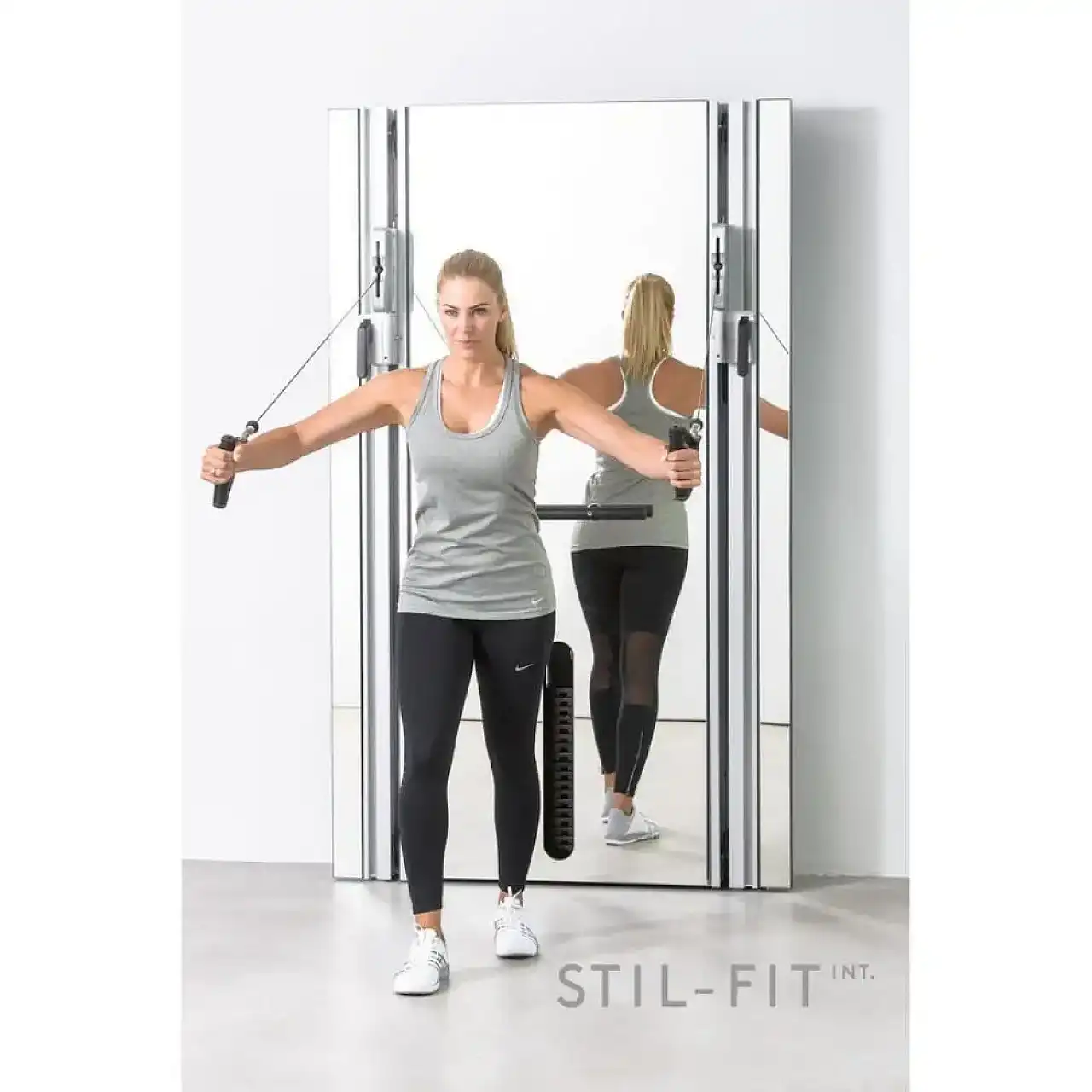 Передня частина дзеркала приклеєна безпосередньо до дерев’яної дошки, що робить її дуже міцною та витримує незначні удари без ризику розбити скло. Дзеркальні фасади є важливим аспектом у спортзалі. За допомогою шнурка Stil-Fit Essence ви принесете це відчуття у свій дім.