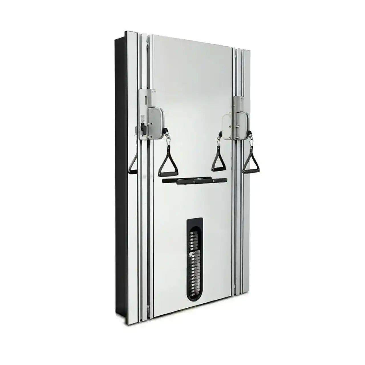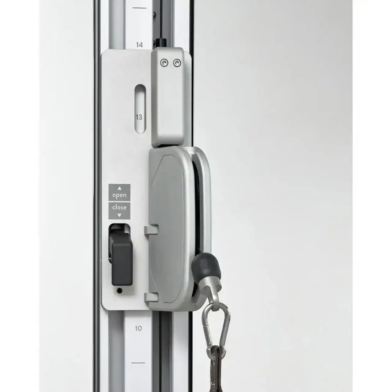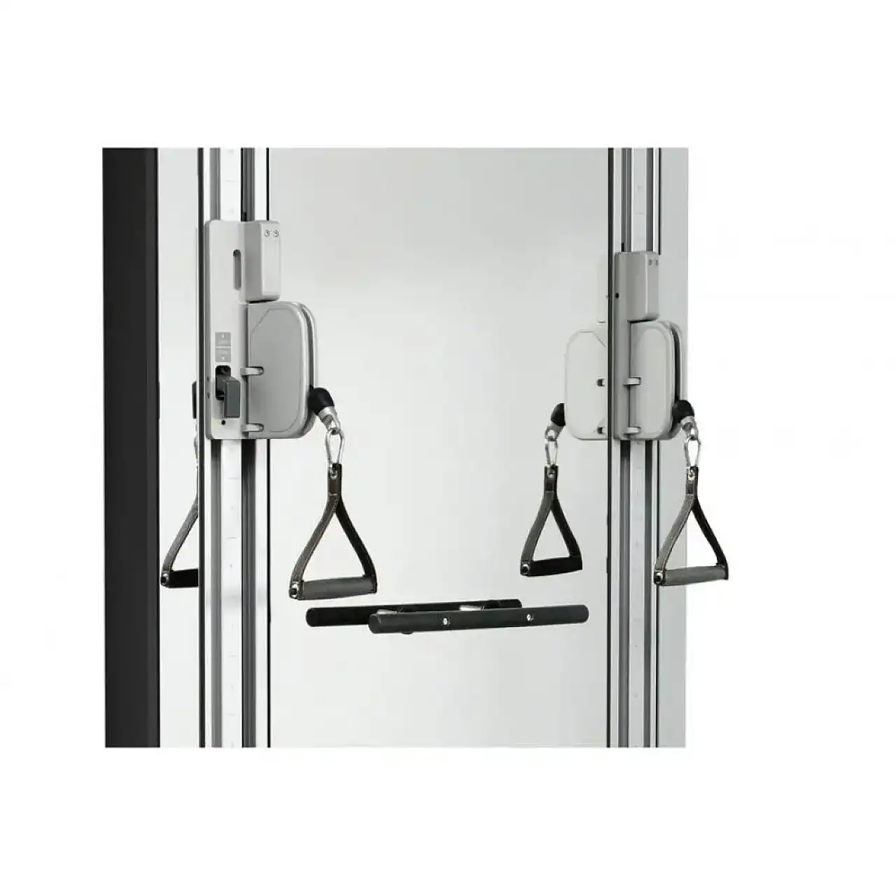 Питання регулювання висоти підйомників вирішено дуже практичним і простим способом. Загальна вага гирі становить 87,5 кг і ділиться на 15 менших гир по 5 кг і 4 гирі по 2,5 кг (плюс початкове навантаження 2,5 кг). Завдяки невеликій градації на початку ви також можете виконувати мобілізаційні вправи з низьким навантаженням, що особливо цікаво, коли мова йде про реабілітаційні тренування.