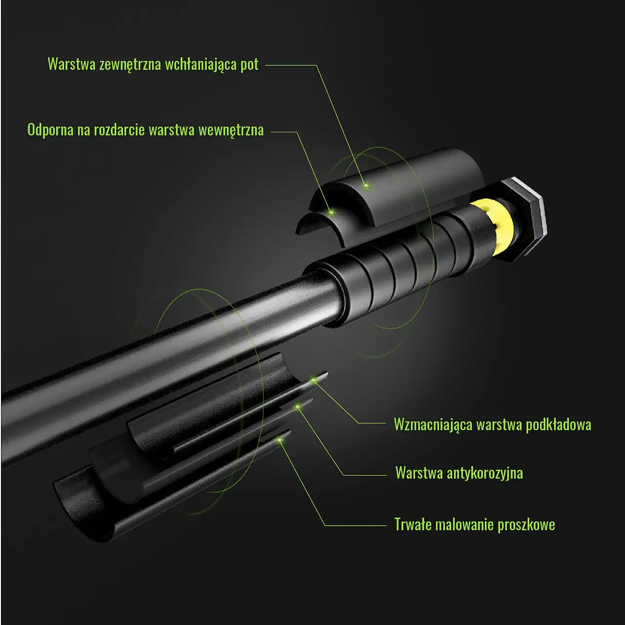 Планка має багато переваг, які підтримують навчання та гарантують безпеку. Тверді силіконові накладки забезпечують стійке положення штанги, а фіксатор запобігає її обертанню. Ручки покриті спеціальним матеріалом, який вбирає піт і запобігає ковзанню рук. Крім того, виріб стійкий до подряпин завдяки антикорозійній ґрунтовці та міцному порошковому покриттю.