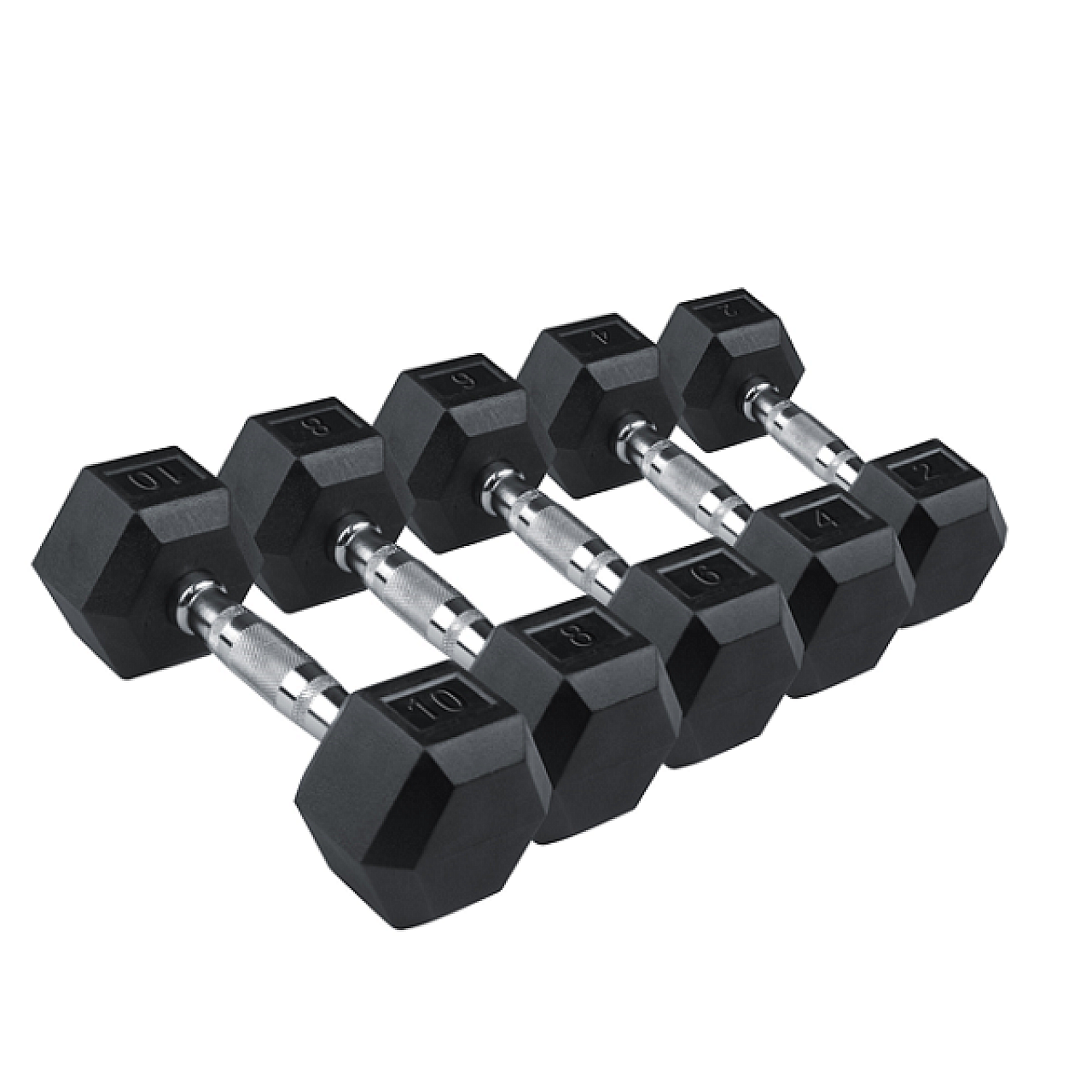 Шестигранні прогумовані гантелі мають прогумовані диски, що мінімізують звук, а також пошкодження обладнання та підлоги.