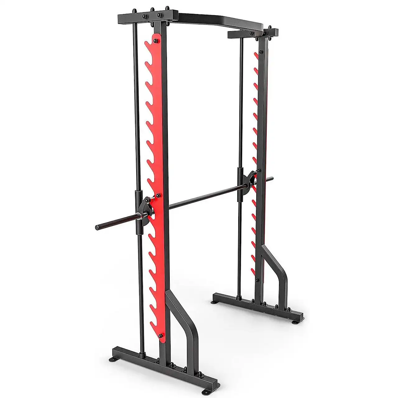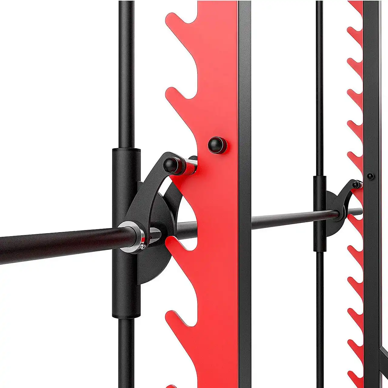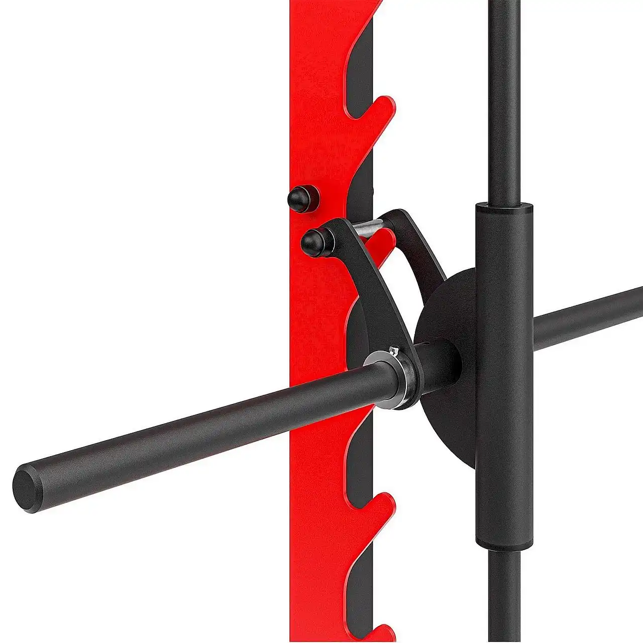 Завдяки двом стабільним напрямним пристрій працює плавно і тихо навіть за максимального навантаження. Машина сміта MS-U105 оснащена 28-мм грифом довжиною 197 см , оснащеним гаками, що фіксують, завдяки яким ви можете легко опустити штангу в будь-який час під час руху. Навантажувальна частина має ширину 42 см і ви можете завантажити її діаметром 29 мм або більше.