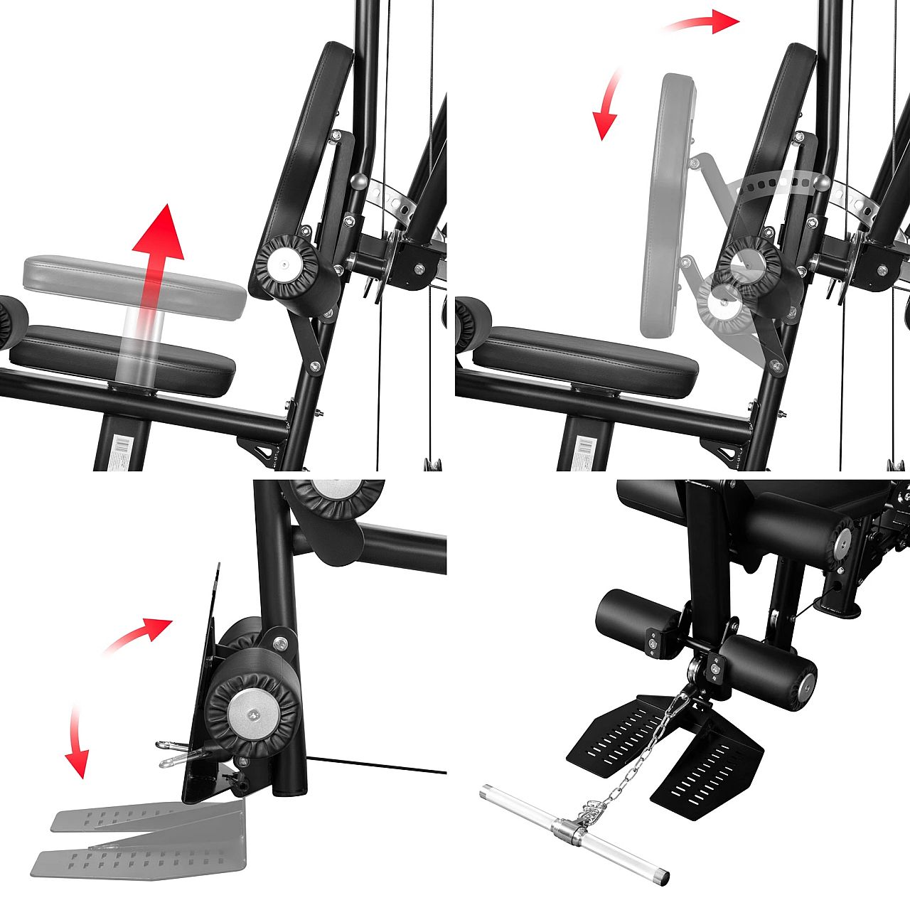 Багатофункціональність – верхній та нижній блоки, жим ногами, важелі для флай- та жимового преса, станція для розгинання ніг.