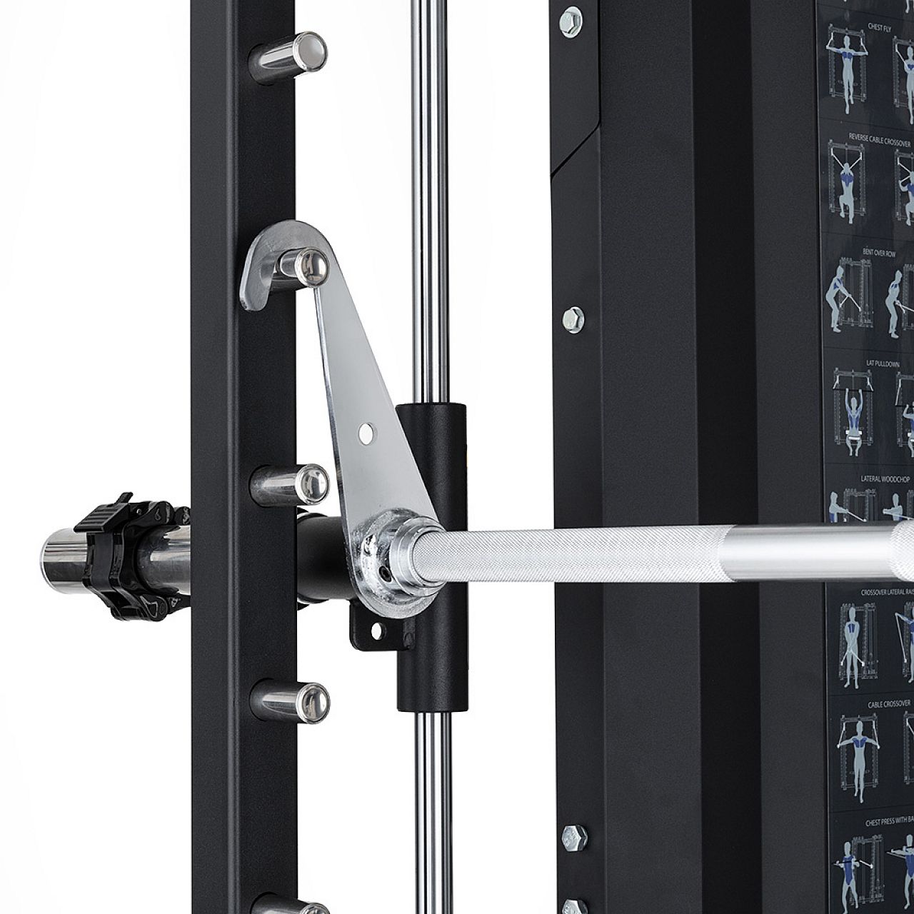 Напрямні штанги-противаги з підшипниками найвищого класу забезпечують плавний рух і безпечне тренування. Завдяки запобіжнику вам не знадобиться спаринг-партнер. Ви також можете використати вільний простір посередині, взяти свою тренажерну лаву та виконувати жими лежачи та інші вправи на лаві.