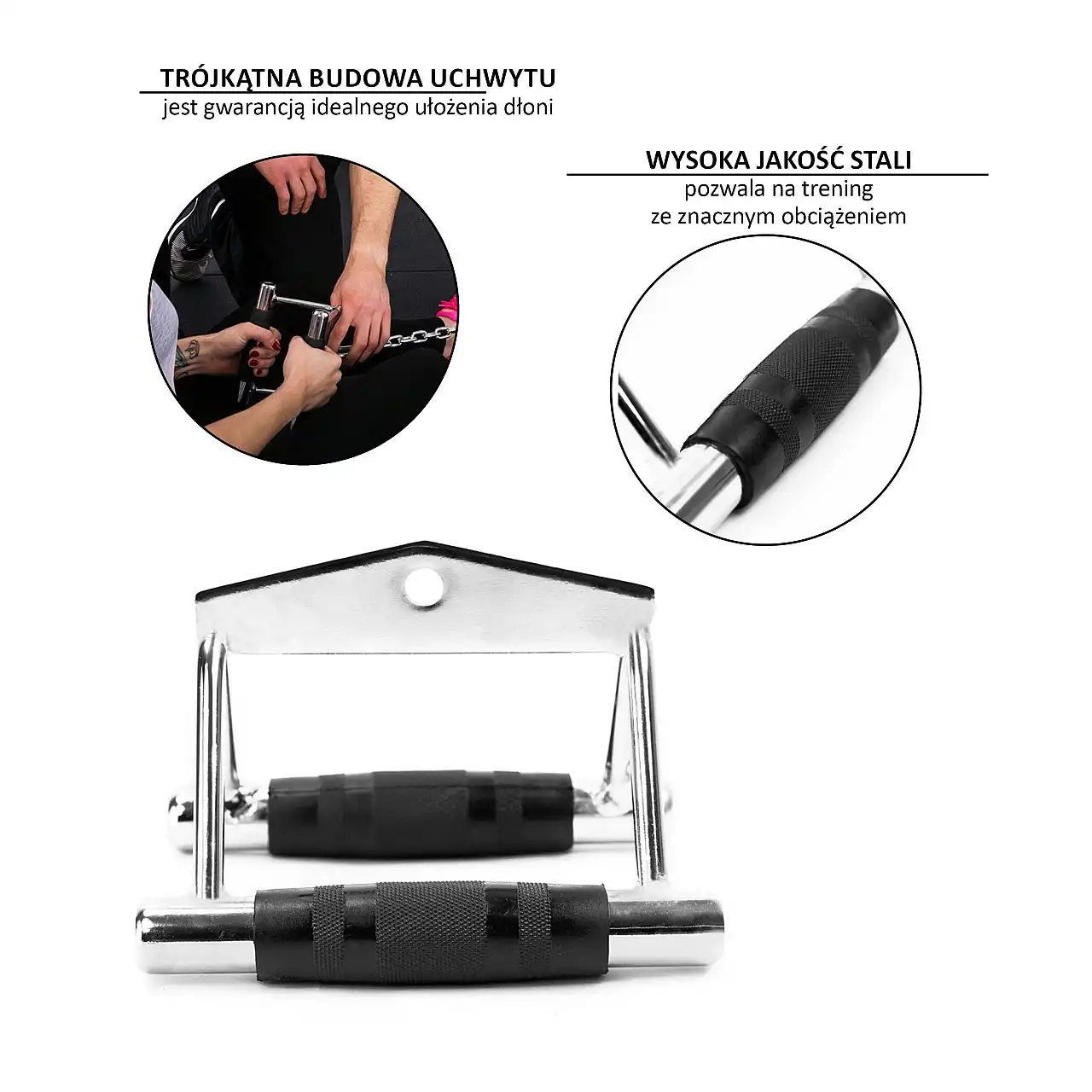 Трикутна структура рукоятки є гарантією ідеального положення руки і в той же час змушує правильний рух під час виконання вправи. Прогумована рукоятка забезпечує міцний хват і запобігає вислизанню інструменту з руки, при цьому вимагає більш міцного захоплення. Завдяки цьому ми також працюємо над розвитком м'язів передпліччя. Не надто широкий рознос ручок полегшує дотримання правильного курсу рухів, тобто утримання ліктів близько до тіла. UW04 виготовлений з високоякісної хромованої сталі, що дозволяє тренуватися зі значним навантаженням.