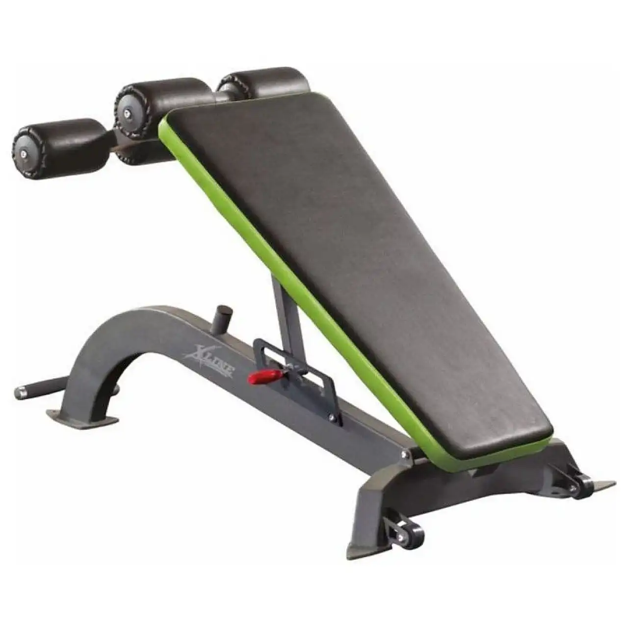 Опис / Лава для преса регульована X-Line R XR311 Лава для преса – універсальний тренажер, який користується популярністю у будь-якому спортивному залі. Регулярні вправи на цьому снаряді дозволяють підтягнути живіт і зробити його атлетичним рельєф. М'язи, що навантажуються При виконанні вправ в горизонтальній площині, основне навантаження припадає тільки на прямі м'язи живота. У цей процес факультативно залучено також чотириголовий м'яз стегна. При нахилі лави під кутом щодо горизонтальної площини м'язи живота проробляються більш ефективно. Так, крім прямих м'язів, у роботу включаються і косі м'язи живота. Також тренування на лаві під кутом дозволяє спалювати зайвий жир. Можливі вправи На лаві для преса виконується підйом тулуба вгору. Для цього ноги фіксуються за допомогою м'яких валиків тренажера, руки з'єднані в замок та знаходяться за головою. На вдиху від лави відриваються плечі, спина та корпус встановлюється під прямим кутом щодо ніг. Положення тіла фіксується на кілька секунд, потім спортсмен повертається у вихідне положення. Також на лаві для преса виконують скручування. Ця вправа передбачає одночасне підняття корпусу та зігнутих ніг з одночасним поворотом напрямку колін убік (скручування корпусу). Також популярною вправою для цього тренажера є підйом прямих ніг. Особливості дизайну Тренажер витриманий у стилі ганьби-тік, дизайну притаманні такі риси, як рівні кути, гострі грані. Зовнішній вигляд тренажера сучасний, стильний, футуристичний, чудово відображає концепцію спортивного тренування. Металева конструкція виконана за допомогою високотехнологічного комбінованого згину профілю, що позитивно позначається на загальному виді тренажера. Зварні шви виконані професійно та максимально акуратно. Слід зазначити ергономіку обладнання – вся конструкція спроектована з урахуванням призначення та цілей тренажера, а тому максимально зручна для користувача. Завершує образ високоякісна хромована фурнітура. Це заглушки болтів, шайби, брендовані логотипом виробника, гумові ручки з нанесеним рельєфом, що забезпечує найкраще захоплення, гумові накладки на основу тренажера, що усувають шум і вібрацію, що запобігають ковзанню. Металева конструкція тренажера покрита порошковою фарбою, колір напилення може бути наступний: Чорний Сірий Білий Сірий металік Темно-сірий Крім того, покриття може мати різну текстуру - бути матовим або глянсовим. Сидіння та м'які частини виконуються з високоякісної екошкіри. Замовити тренажер можна з м'якими деталями, виконаними в одному кольорі або в комбінованому варіанті. До замовлення доступні такі відтінки: Синій Білий Чорний Світлий відтінок зеленого Червоний Сірий Стільки кольору широкі кольори дозволяють отримати зовнішній вигляд тренажера, який точно відповідає перевагам замовника. Також завдяки широкому варіативному ряду можна підкреслити корпоративні кольори вашої компанії, поєднувати тренажери з обраним стилем оздоблення залу. Лінійка тренажерів X-line – це обладнання, виготовлене на основі високих технологій. Лінія виробництва автоматизована, розробкою тренажерів займаються співробітники, які перейняли досвід під час практики США. Тому X-line відрізняється стильним виглядом і функціоналом, який відповідає всім сучасним спортивним тенденціям. Ця лінійка відповідає передовим євр