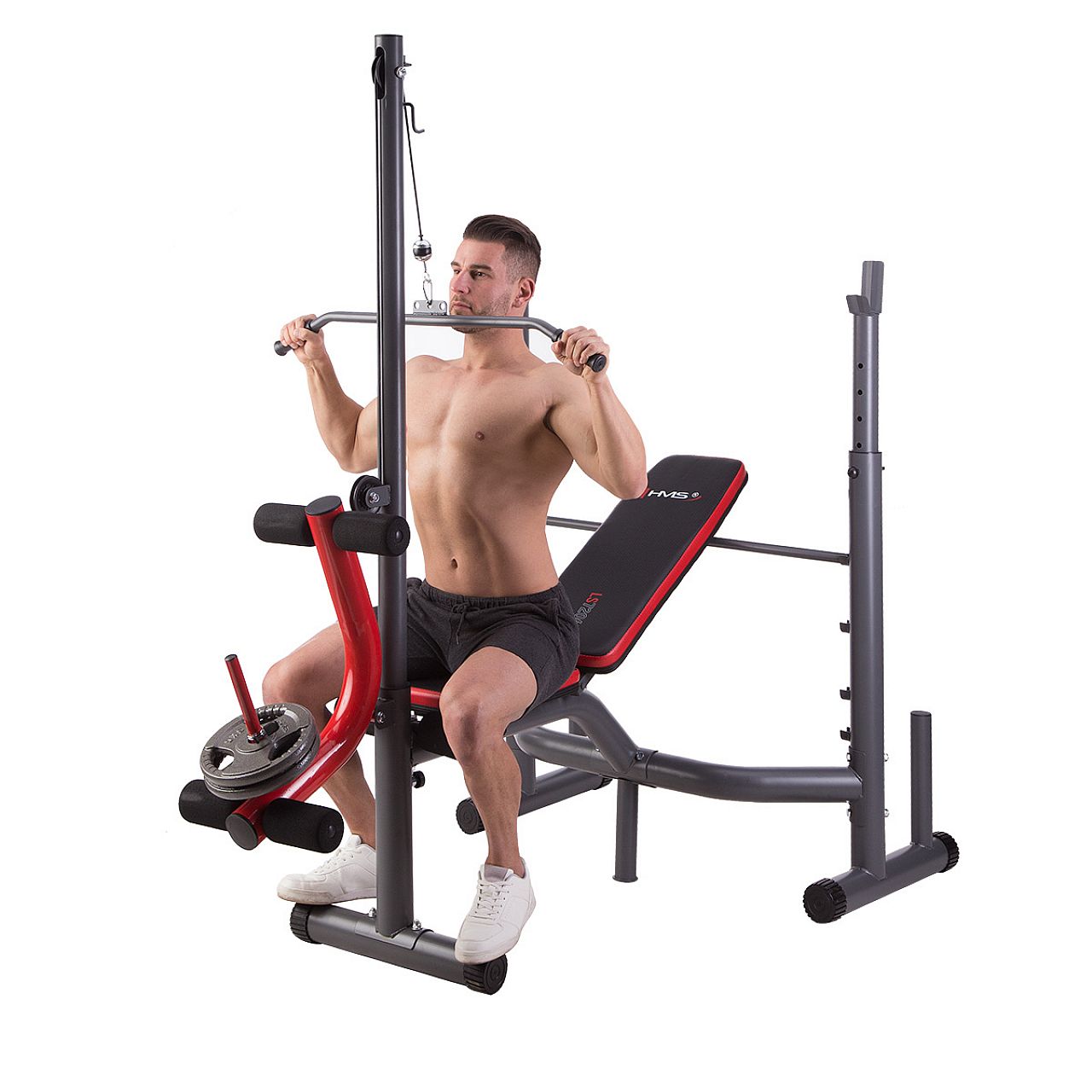 LS7206 HMS - це лава з партою Скотта, приставкою для жиму ногами і та верхньою тягою , яка призначена для тренувань зі штангою, гантелями і дисками.