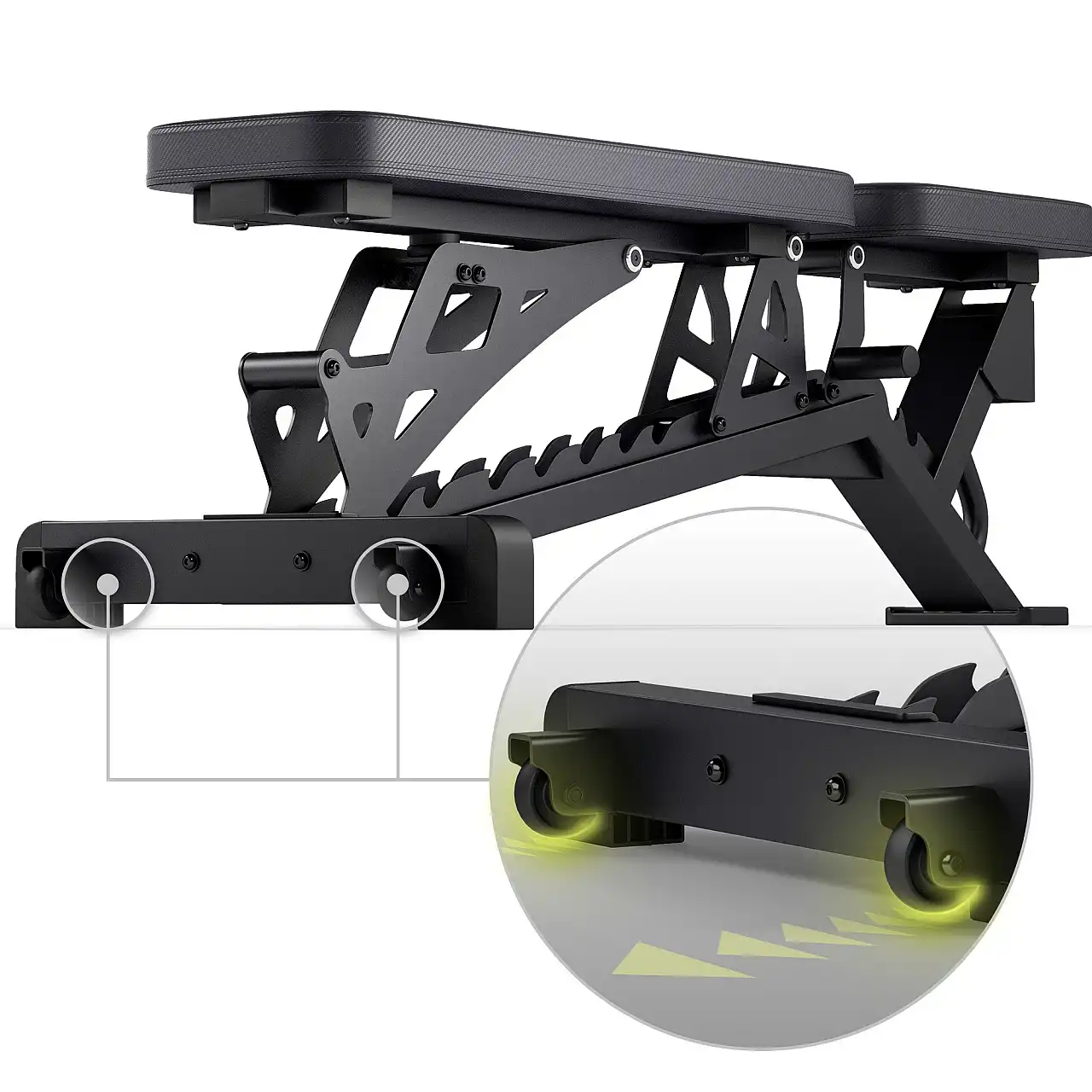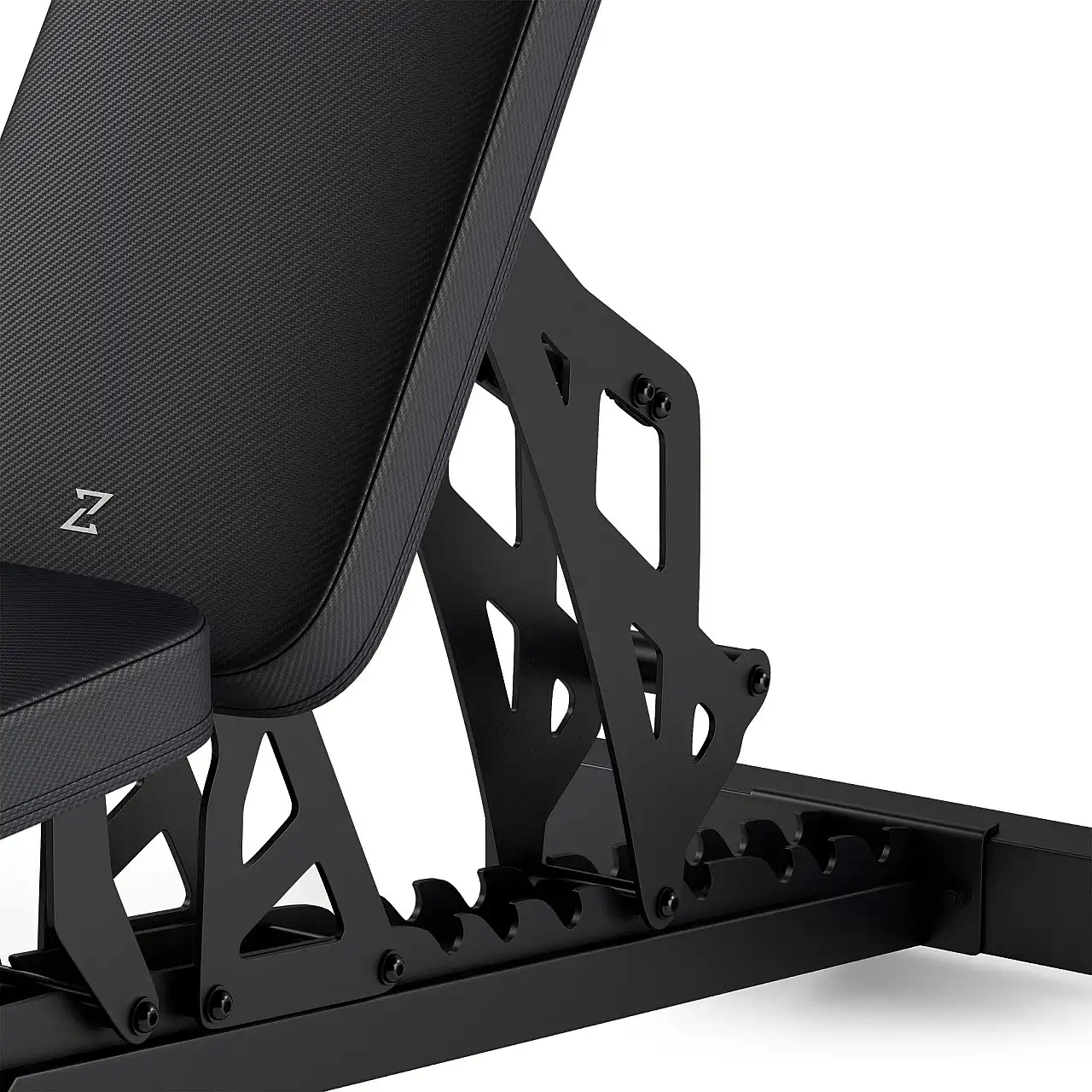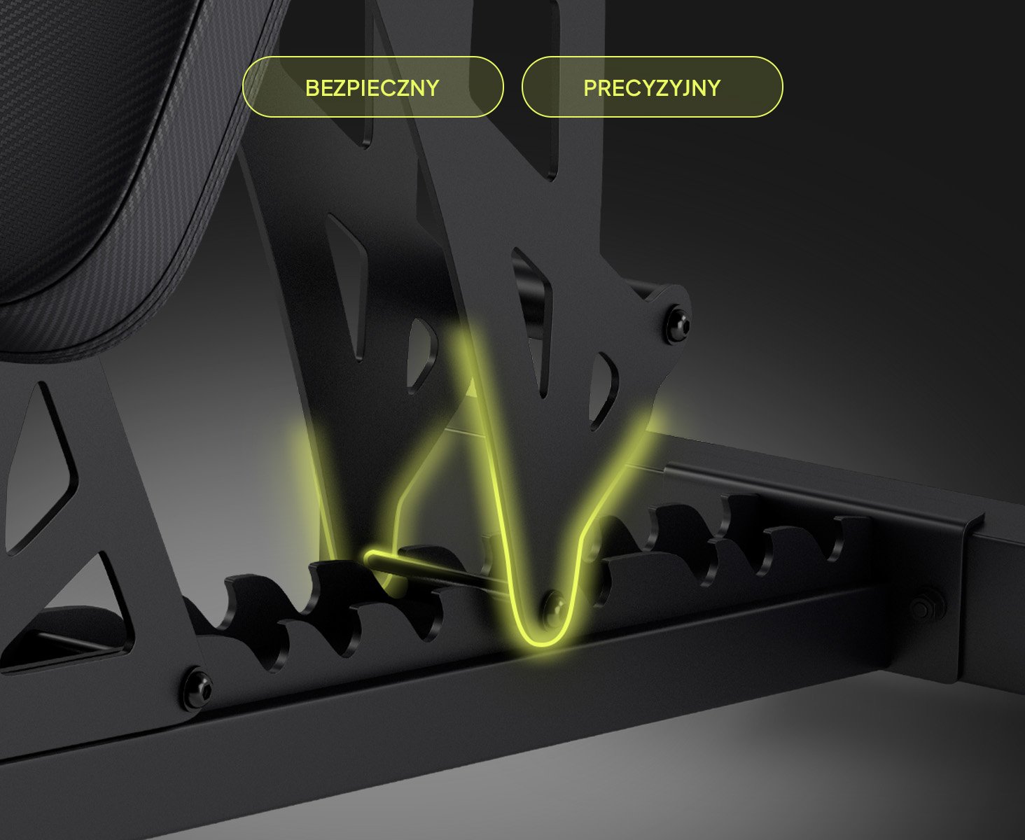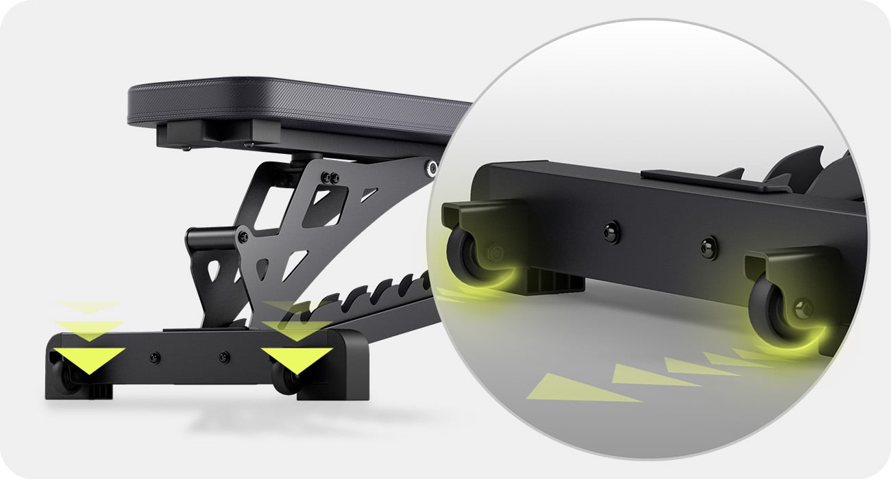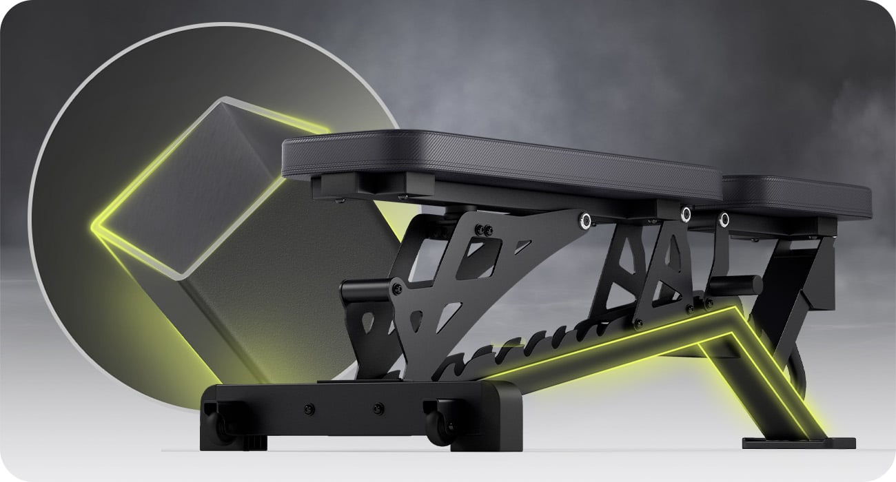 Амортизатор розташований у місці з'єднання спинки з каркасом лави, що підвищує комфорт і зменшує вібрації під час тренування. Це рішення захищає конструкцію та забезпечує плавніше та тихіше використання – навіть під час інтенсивних тренувань.