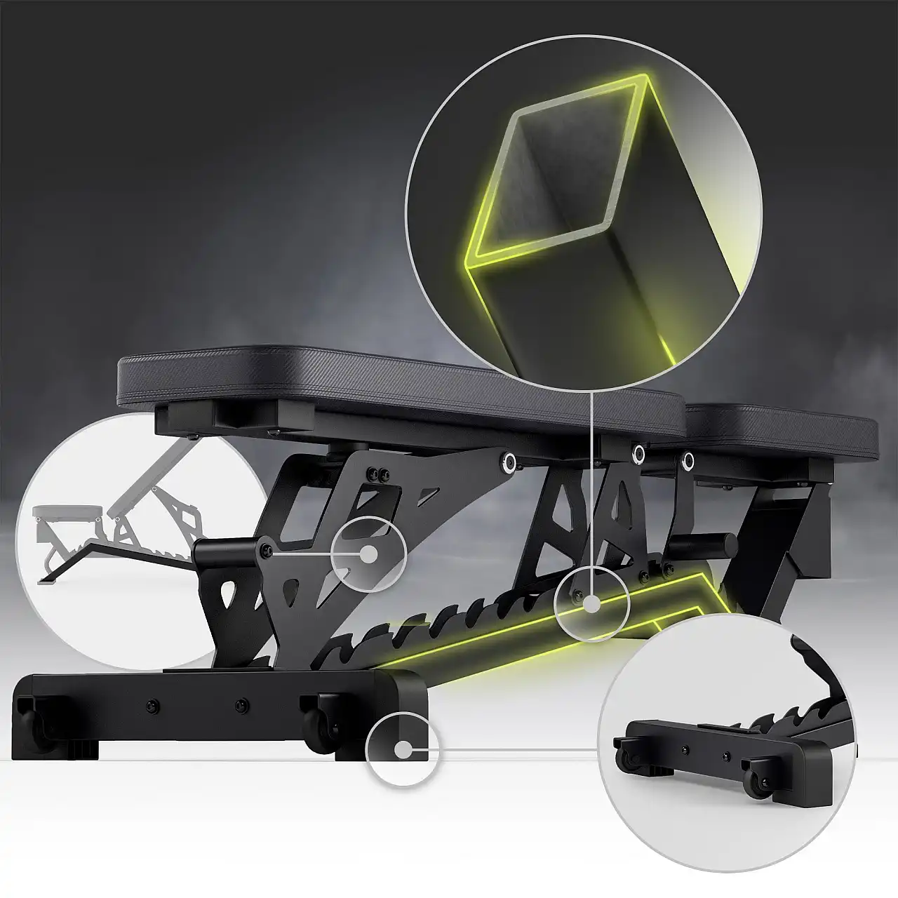 Завдяки регульованій спинці та сидінню, лава дозволяє виконувати різноманітні вправи, такі як жим лежачи, тяга гантелей однією рукою з опорою на лаву, а також силові тренування, зосереджені на м'язах ніг та сідниць, використовуючи функції болгарського присідання та тяги стегнами на лаві.