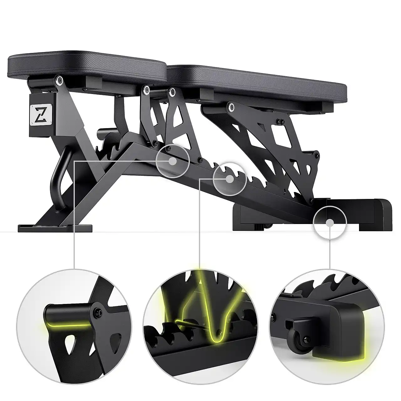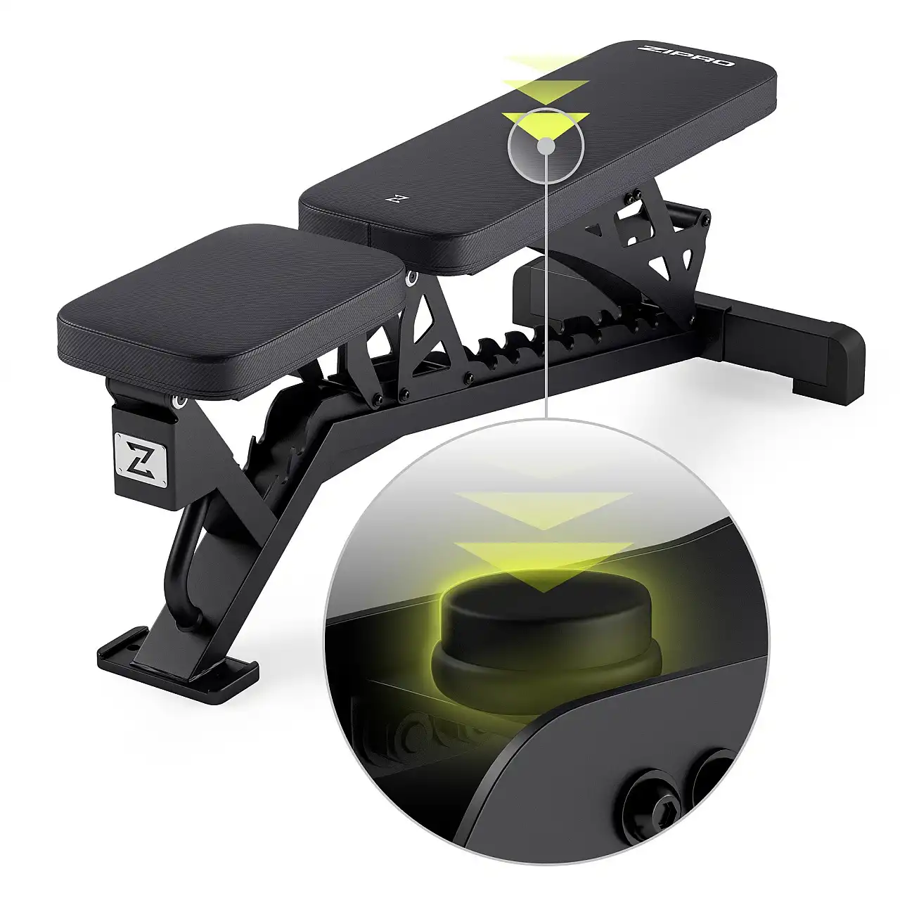 Тренувальна лава Zipro Pumpiron встановлює нові стандарти простоти та безпеки. Регулювання спинки та сидіння здійснюється простим переміщенням кронштейнів у певні положення на профілях. Конструкція запобігає випадковим падінням, забезпечуючи швидке та безпечне регулювання. Кожне регулювання інтуїтивно зрозуміле та просте, що дозволяє вам повністю зосередитися на тренуванні.