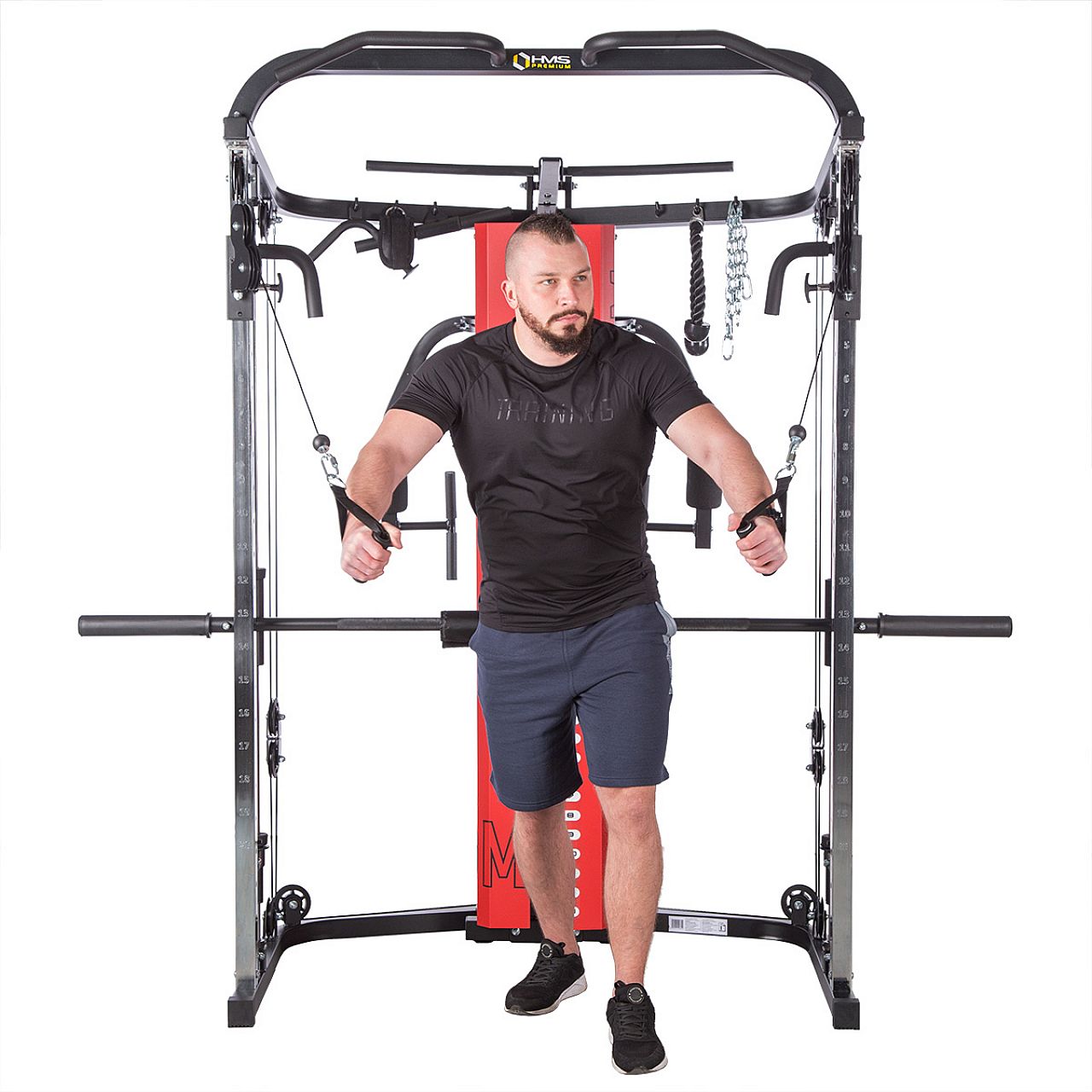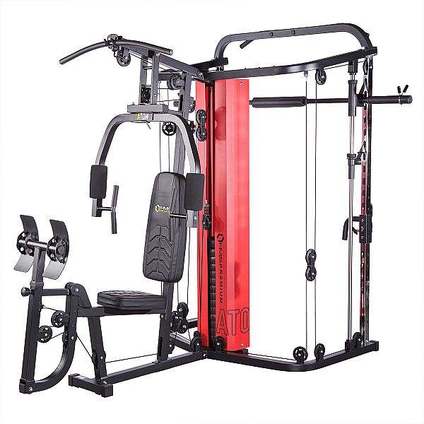 HMS Premium Atom включає машину Сміта, два регульовані за висотою блоки, важіль для жиму, який легко перетворюється на метелик, зону для жиму ногами та турнік. Ці компоненти дозволяють виконувати вправи для кожної групи м'язів, що робить тренажер справді універсальним. У комплект входять додаткові ручки для підтягувань, щоб підвищити ефективність тренувань.