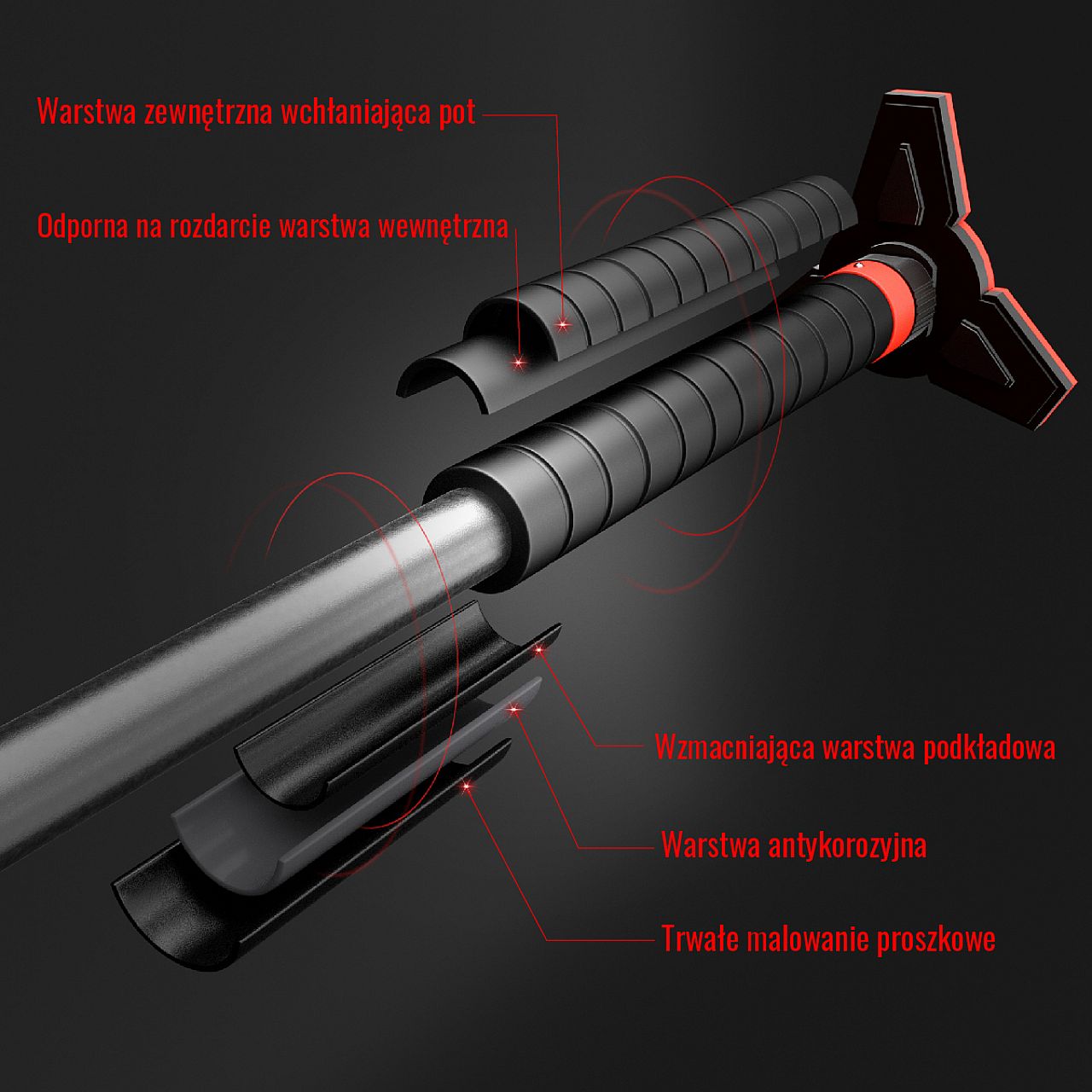 Ручки турніка вкритіантиковзним матеріалом, який ефективно поглинає вологу та запобігає ковзанню рук під час тренувань. Додатковий захист від подряпин та іржі забезпечуєзносостійке порошкове фарбування, що продовжує термін служби виробу.
