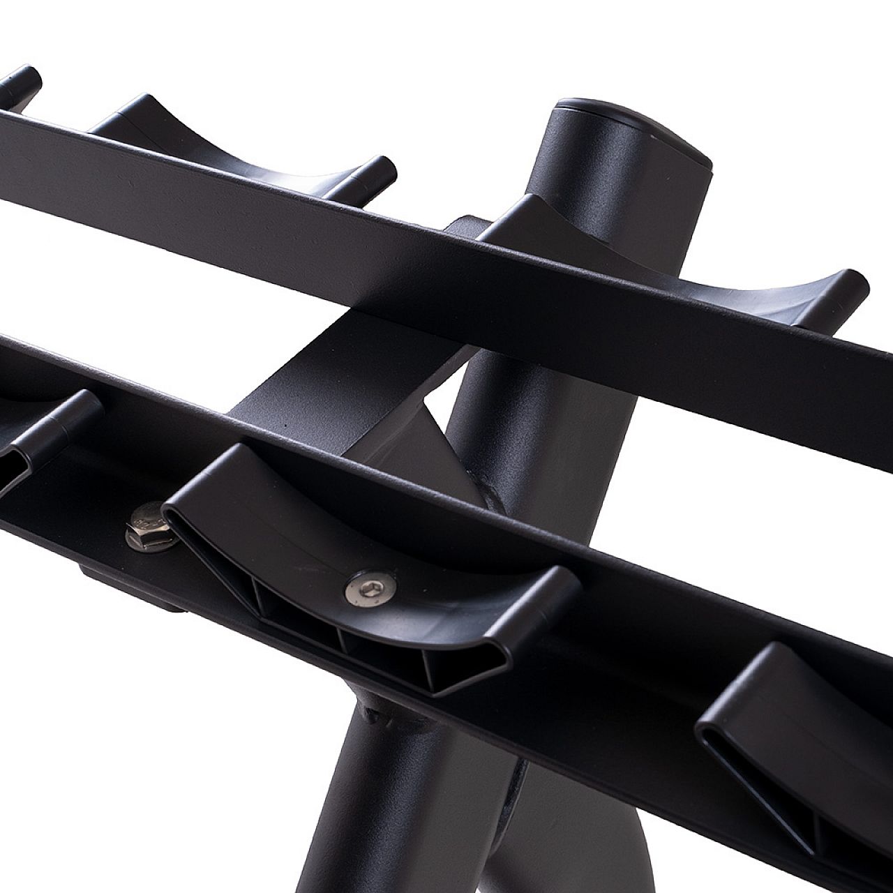 Завдяки двополичній одноручній стійкі для гантелей inSPORTline GymRack II ваш тренажерний зал завжди буде охайним! Завдяки міцній сталевій рамі стійка витримує вагу до 600 кг , забезпечуючи широкий вибір варіантів тренувань. Окремі полиці вигнуті , щоб навіть заокруглені гантелі не впали. Відстань між тримачами достатньо велика, щоб гантелі було легко взяти та вийняти зі стійки.