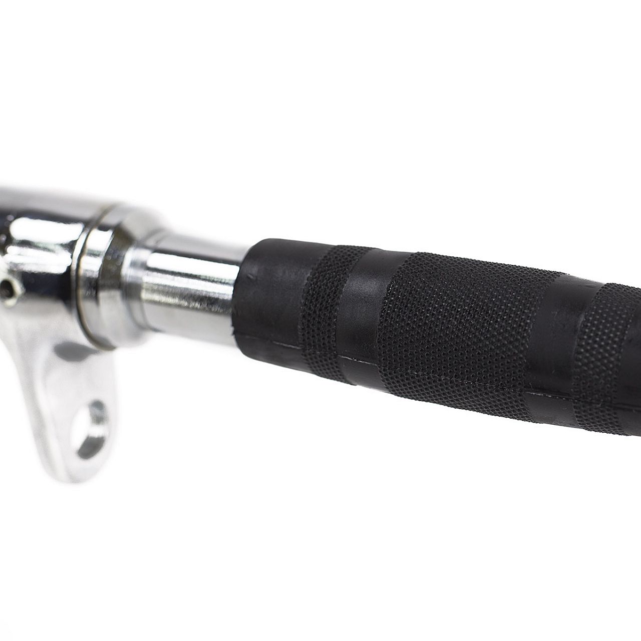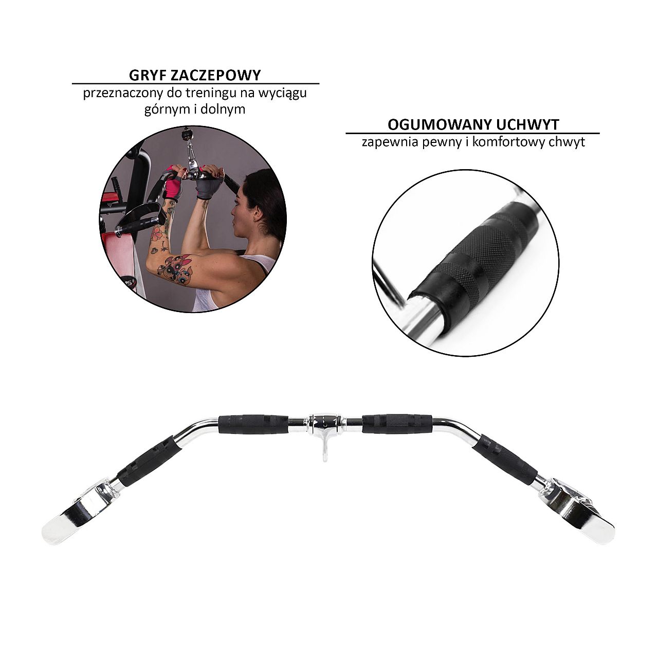 Виготовлений з високоякісної сталі, що дає можливість тренуватися зі значним навантаженням. Його довжина та відстань між прогумованими ручками гарантують безліч варіантів захоплення - від дуже вузьких до дуже широких. Завдяки цьому ручка дозволить розвивати м'язи на різній довжині їх кріплень при кожній вправі. У найширших місцях ручки встановлені під кутом, що сприяє підтягуванню ліктів до тулуба, що сприяє кращому утриманню техніки виконання вправи. Під час тренування хват дозволяє задіяти альтернативні м'язові прикріплення по відношенню до вправ на простий хват. Цьому сприяють екстремальні ручки, встановлені в нейтральному хваті. Крім того, вони прогумовані, що забезпечує надійний і зручний хват, не хвилюючись про те, що спорядження вислизне з рук.