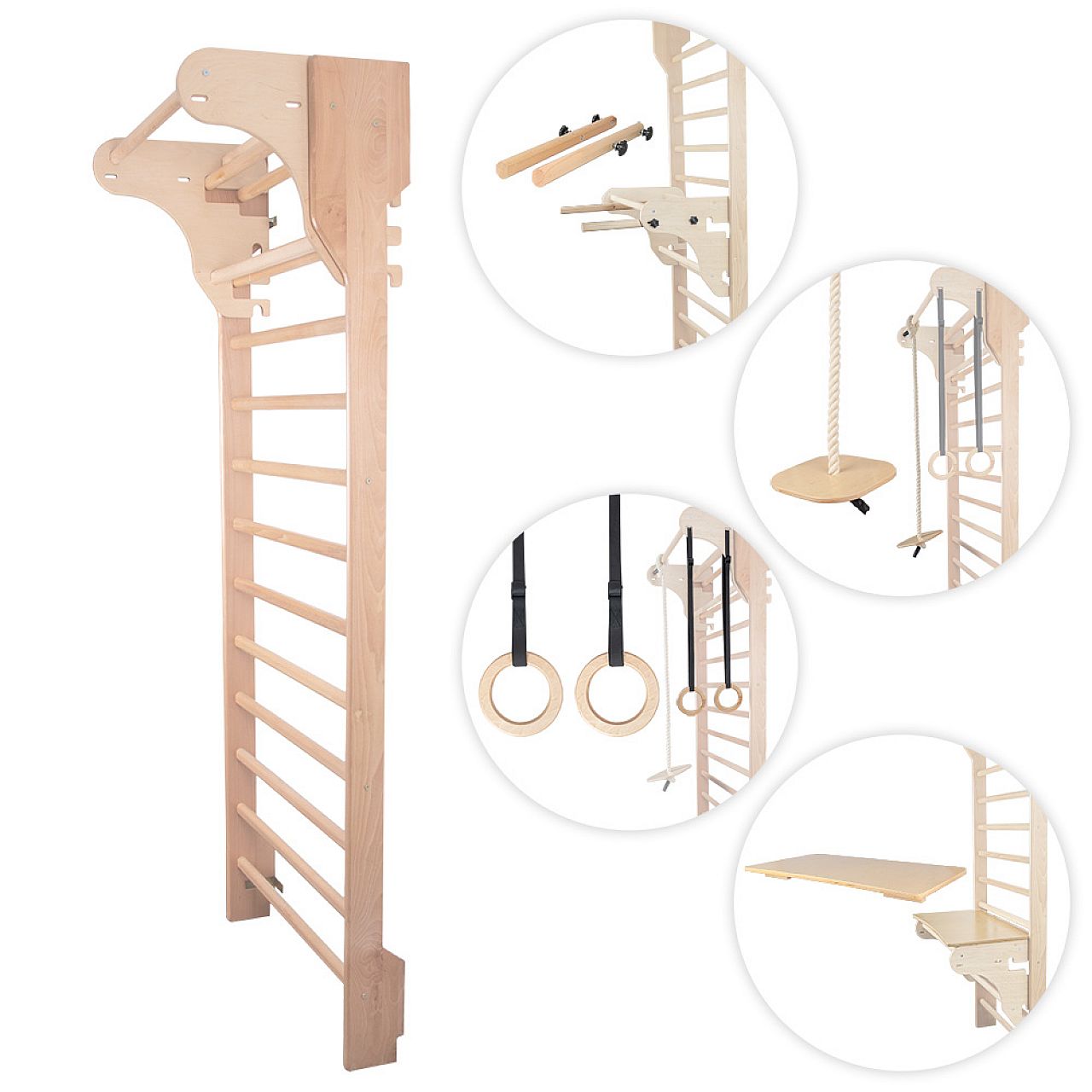 Призначені для тренувань вдома, ці стінки допоможуть вам покращити фізичну форму, зміцнити м’язи та покращити баланс. Вони оснащені висячою дерев’яною штангою для підтягувань , яку можна легко прикріпити до будь-якої поперечини, що дозволяє тренувати м’язи спини та решту верхньої половини тіла. Є також прості, але надзвичайно практичні бруси . Діти можуть також оцінити інші аксесуари, що входять до комплекту, — гімнастичні кільця з міцними ременями, що регулюються по довжині, і підвісну гойдалку з сидінням розміром 29,5 x 29,5 см. Ви навіть можете повісити штангу для підтягувань на одну з нижніх перекладин і прикріпити до неї стільницю , на якій малюк зможе малювати або робити уроки.