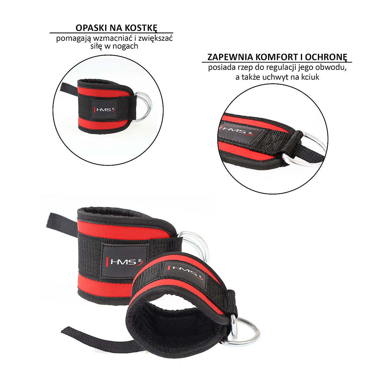 Ремінці HMS допомагають зміцнити та збільшити силу ваших ніг, стегон, сідниць і стегон. Неопренова підкладка забезпечує безпеку і комфорт в гомілковостопному суглобі, зручний і міцний матеріал підвищує комфорт тренувань. Міцне подвійне сталеве кільце дозволяє тренуватися на будь-якому типі підйомника.