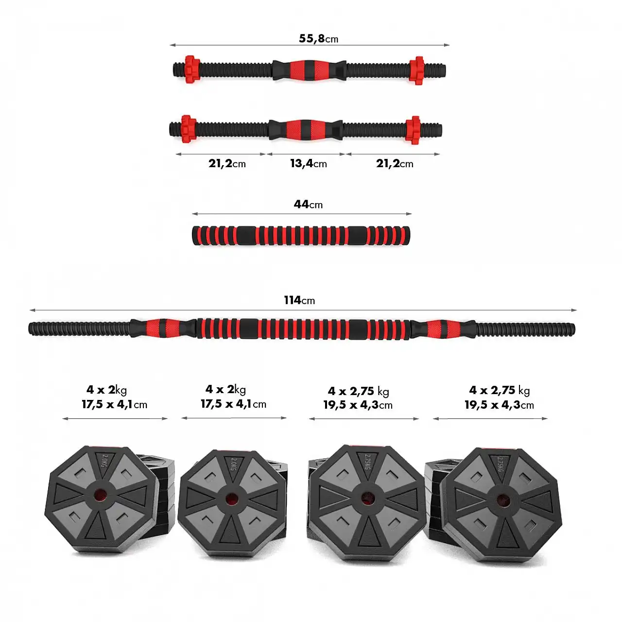 Спеціальний подовжувач дозволяє з'єднати дві короткі планки в одну довгу, що дає змогу використовувати набір як штангу для ще більшої кількості вправ. Це рішення дозволяє виконувати вправи, які важко або незручно виконувати з гантелями, забезпечуючи універсальність тренувань.