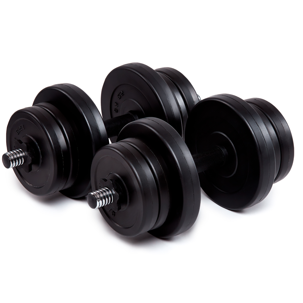 Диски вкриті кількома шарами пластику, що забезпечує захист підлоги, панелей, плиток при падінні гантелі. У набір входить також солідний прямий гриф із гвинтовими клемами, загальною довжиною 45 см. Ключовими елементами грифа є гвинтові закінчення та клеми, рифлені рукоятки – ці елементи покращують кожне тренування.