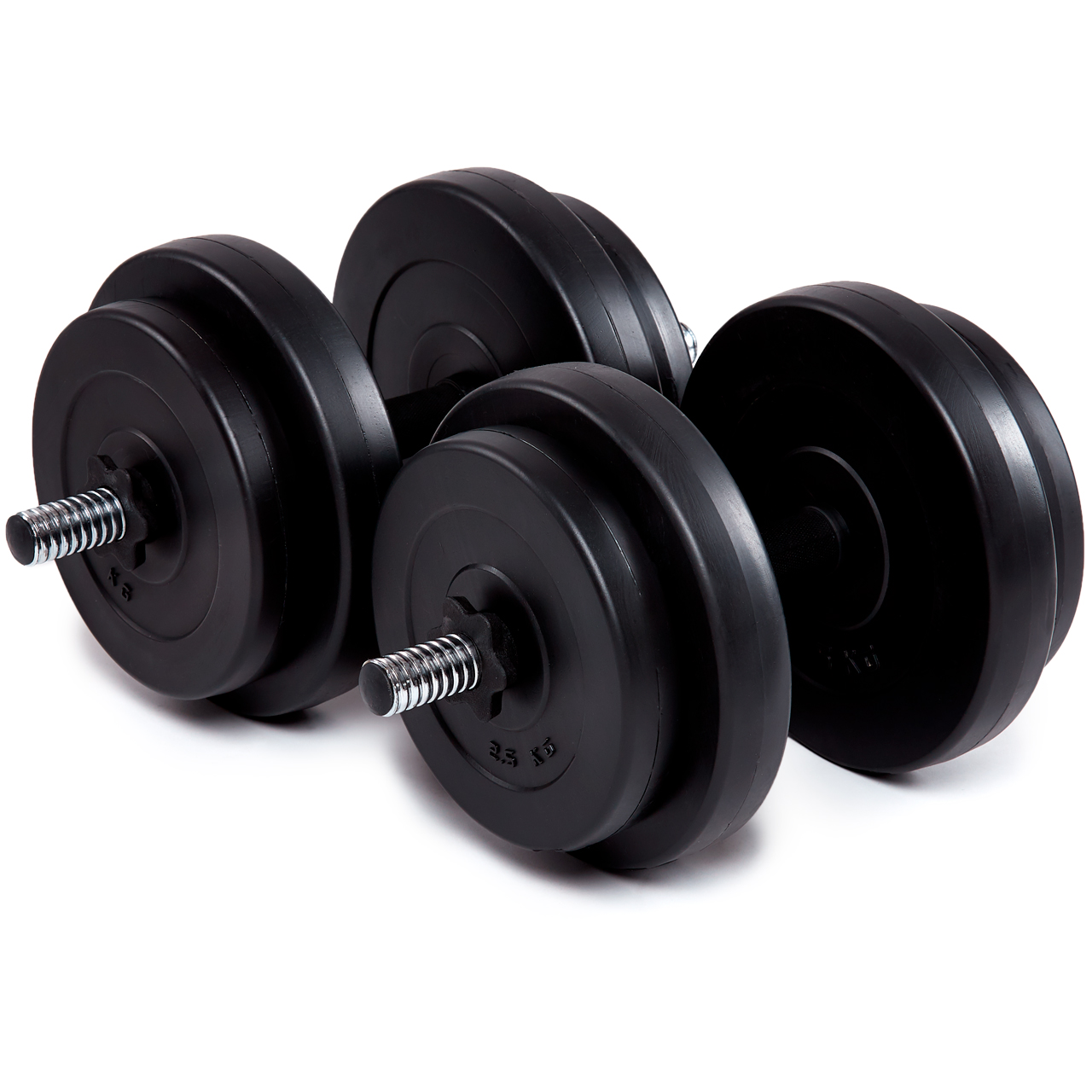 Диски вкриті кількома шарами пластику, що забезпечує захист підлоги, панелей, плиток при падінні гантелі. У набір входить також солідний прямий гриф із гвинтовими клемами, загальною довжиною 45 см. Ключовими елементами грифа є гвинтові закінчення та клеми, рифлені рукоятки – ці елементи покращують кожне тренування.