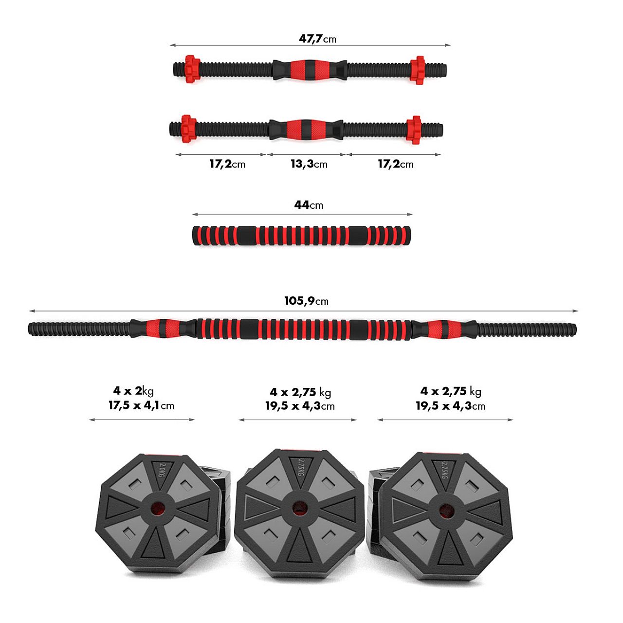 Завдяки спеціальному подовжувача ми можемо з'єднати дві короткі планки в одну довгу. Це інноваційне рішення значно розширює спектр можливостей виконання вправ. Ми отримуємо штангу, з якою ми можемо виконувати вправи, які неможливо або незручно виконувати з гантелями. Коли ви вибираєте один продукт, ви отримуєте два.