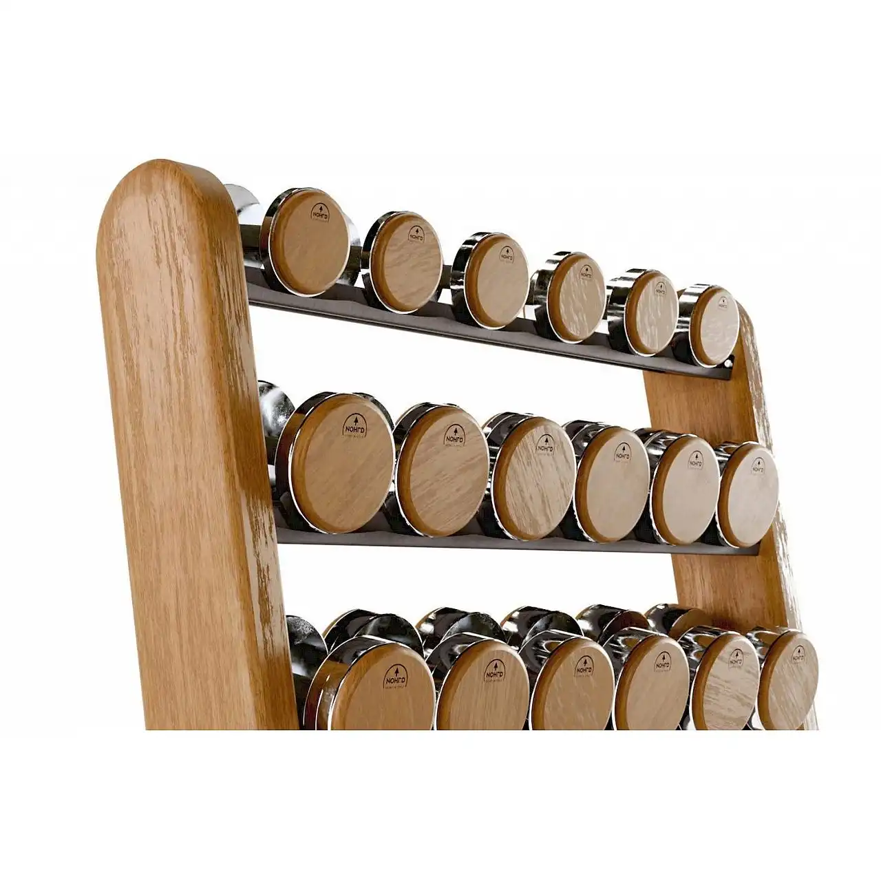 При виробництві гантелей NOHRD велику увагу було приділено зовнішньому вигляду всіх гантелей. Вони були оброблені на верстатах з ЧПУ з використанням нікельованої сталі разом з дерев'яними декоративними дисками. Це дійсно благородний дизайн, який занурює кожного користувача в королівську атмосферу. Відчуйте себе справжнім господарем свого тіла і сформуйте всі м'язи з гантелями NOHRD.