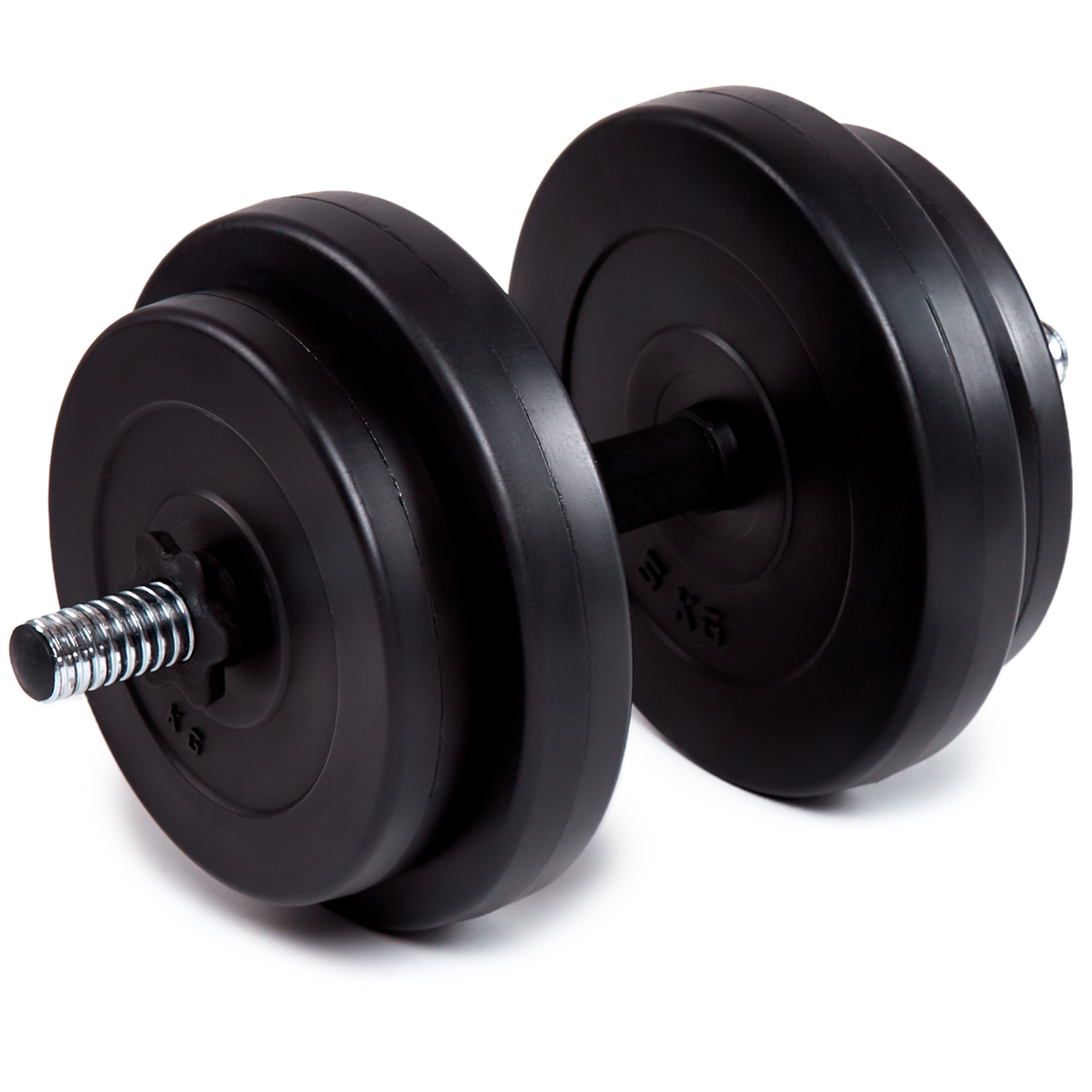 Диски вкриті кількома шарами пластику, що забезпечує захист підлоги, панелей, плиток при падінні гантелі. У набір входить також солідний прямий гриф із гвинтовими клемами, загальною довжиною 45 см. Ключовими елементами грифа є гвинтові закінчення та клеми, рифлені рукоятки – ці елементи покращують кожне тренування.