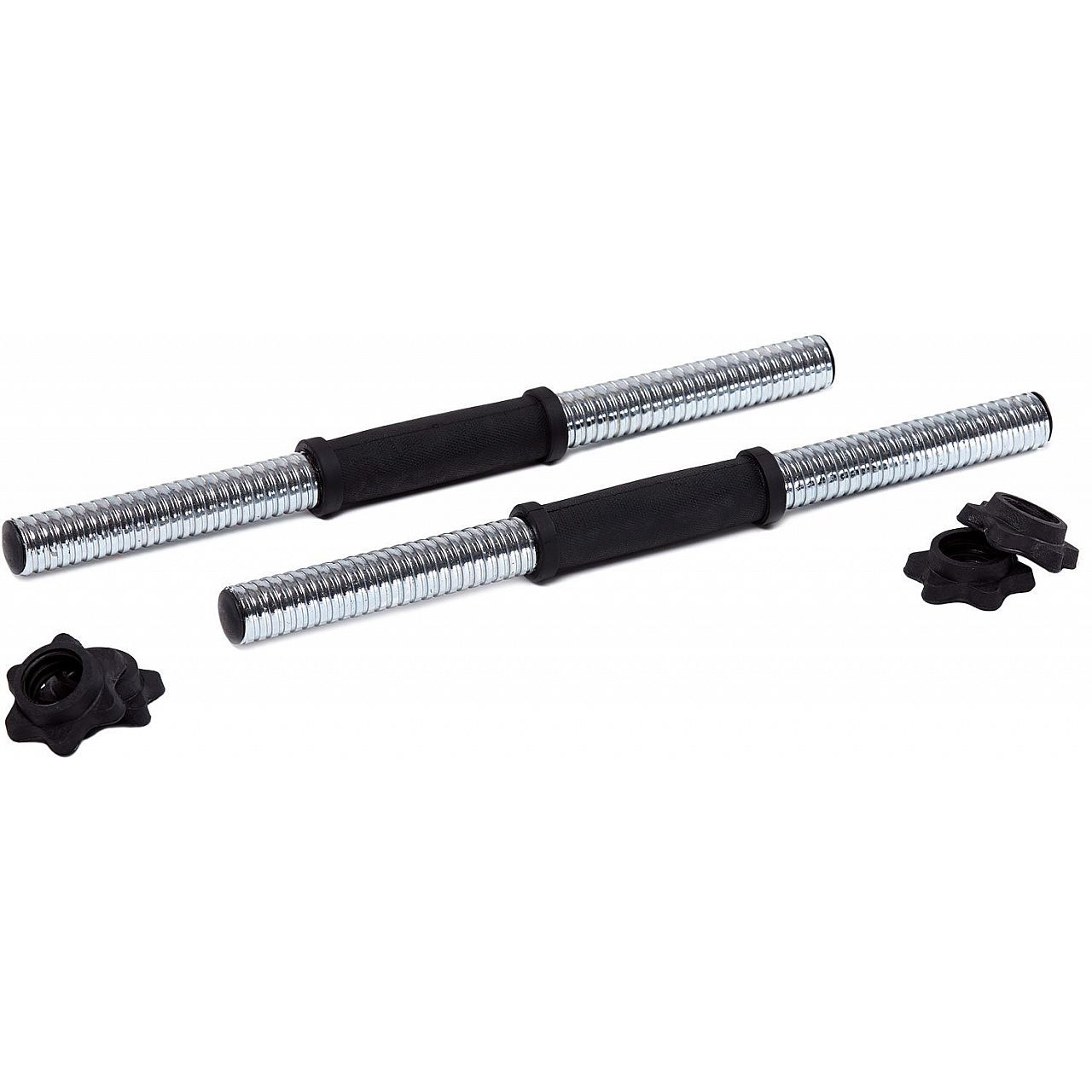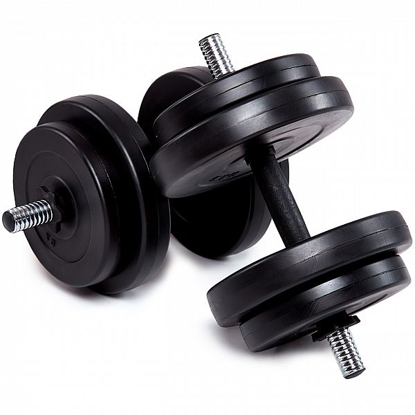 Диски вкриті кількома шарами пластику, що забезпечує захист підлоги, панелей, плиток при падінні гантелі. У набір входить також солідний прямий гриф із гвинтовими клемами, загальною довжиною 45 см. Ключовими елементами грифа є гвинтові закінчення та клеми, рифлені рукоятки – ці елементи покращують кожне тренування.
