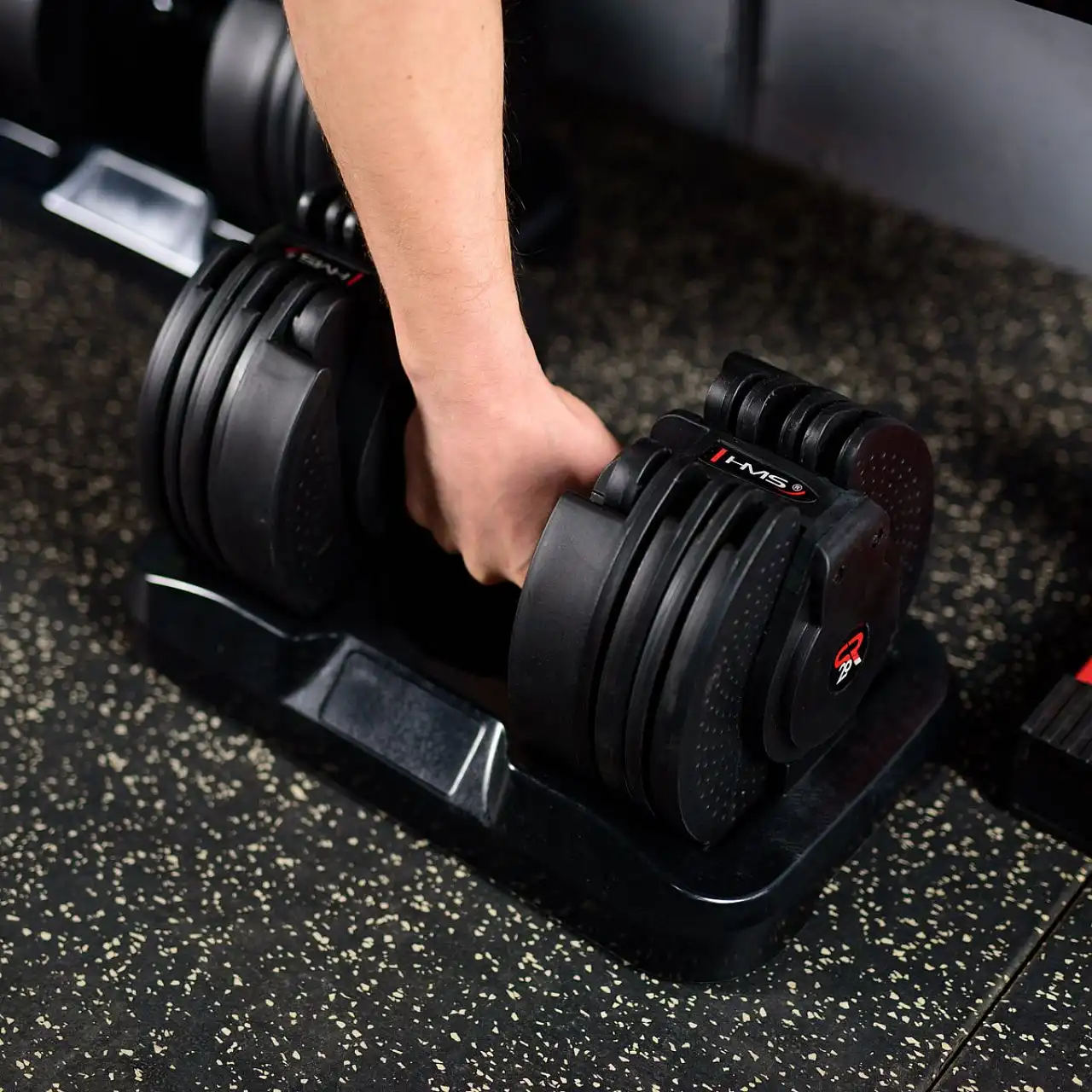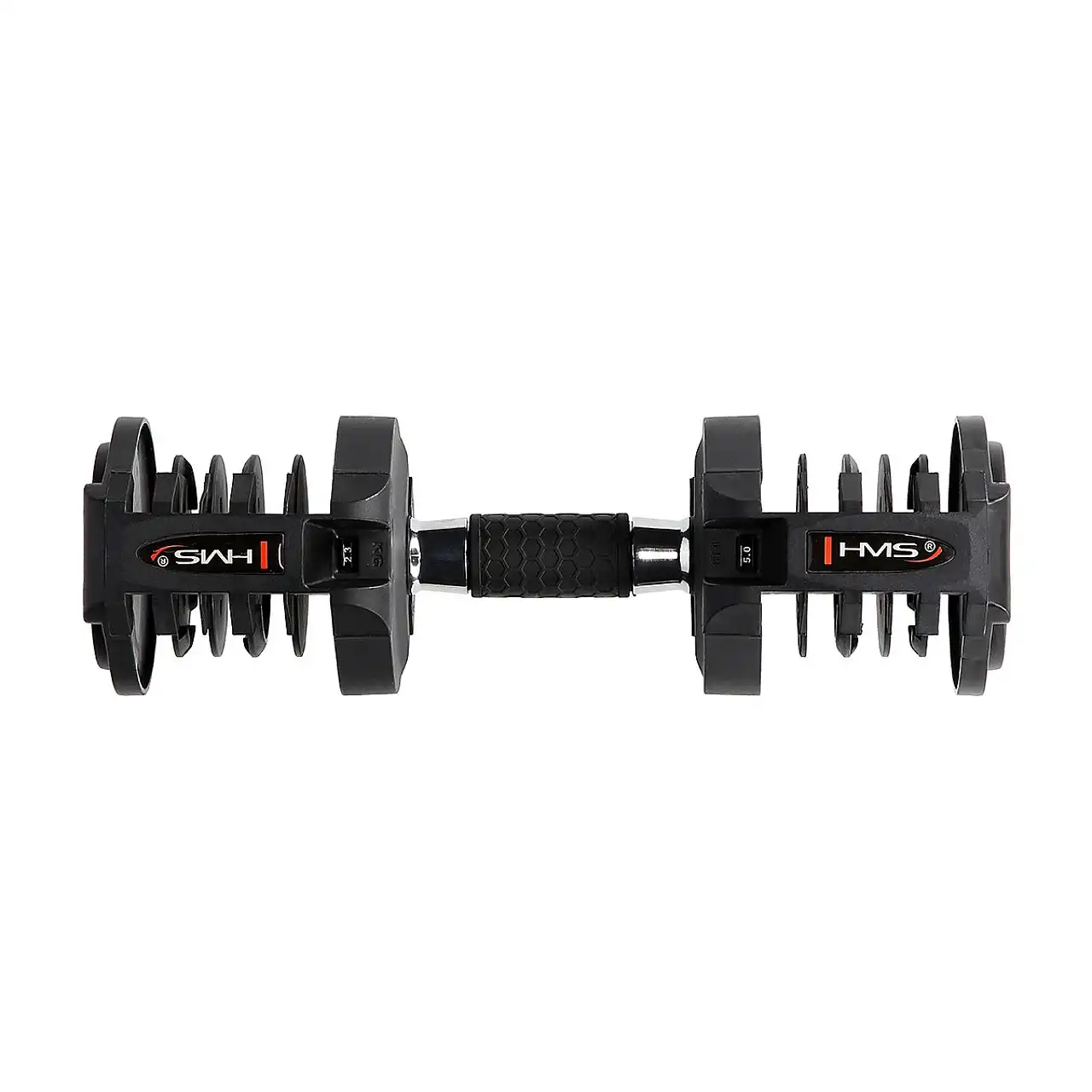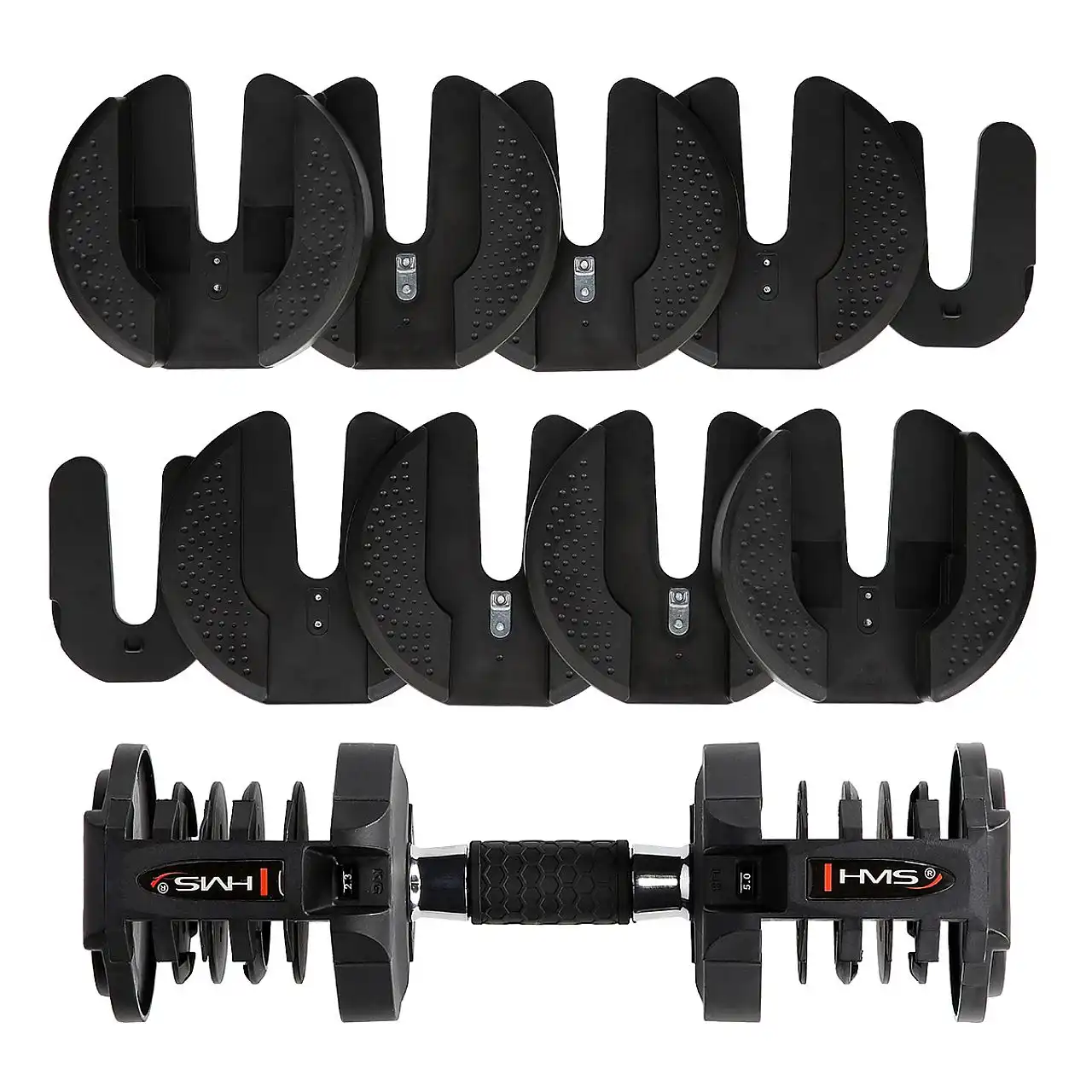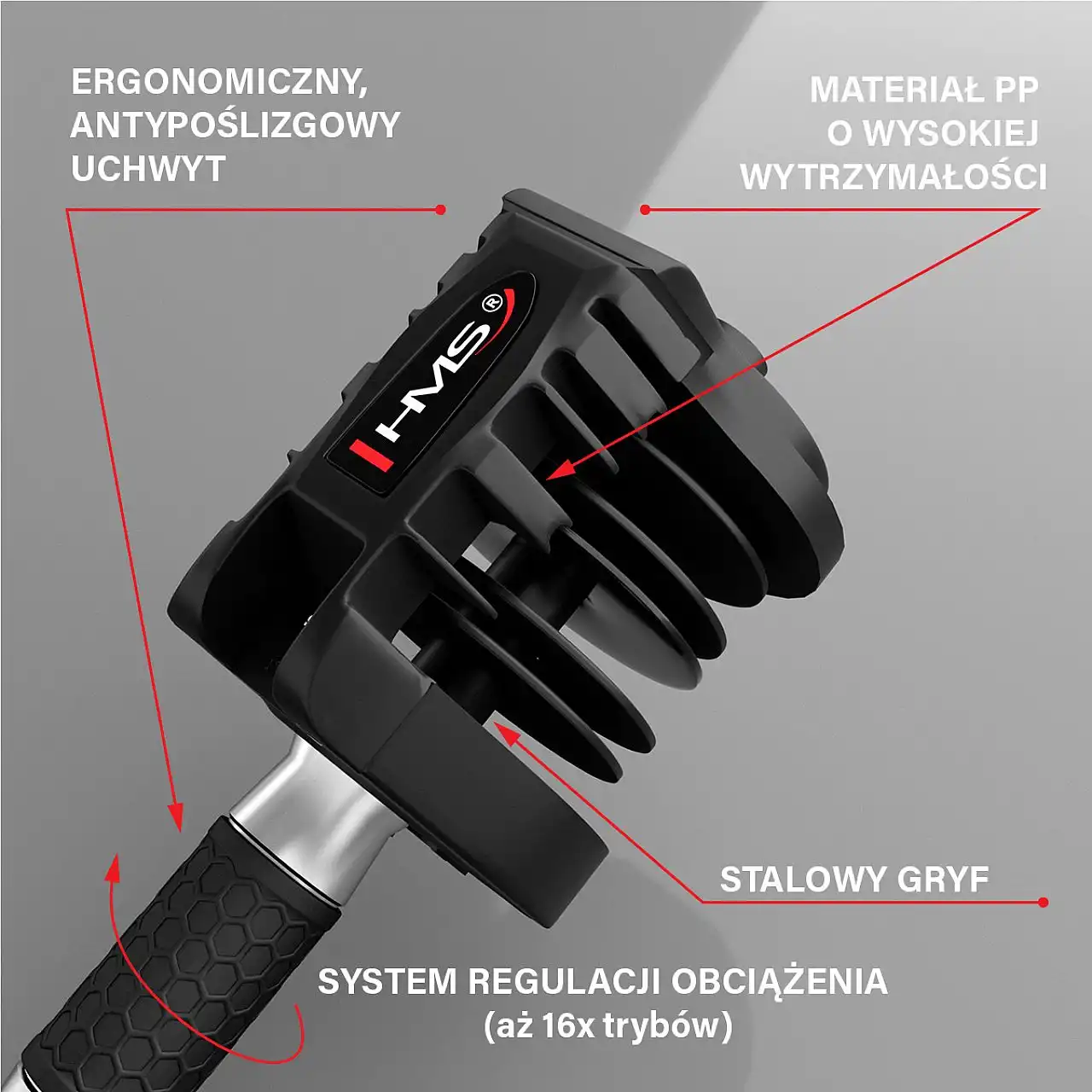 У набір входить гриф, 10 дисків та підставка. Пристрій є ідеальним рішенням для людей, які займаються вдома, але він також добре працюватиме в тренажерному залі, замінюючи великий ряд традиційних гантелей. Інноваційна система кріплення пластини забезпечує дуже швидку і легку заміну навантаження під час тренування. На відміну від традиційних гантелей, для демонтажу та монтажу пластин не потрібно кожного разу відкручувати затискачі та монтувати та демонтувати пластини. Коли мова йде про SR20, просто поставте гантель на підставку і встановіть потрібне навантаження двома ручками. Коли планку знову піднімуть, пластини розташуються на ній відповідно до до бажаного налаштування. Виріб виготовлено з матеріалів найкращої якості. Великою перевагою SR20 HMS є ергономічна рукоятка, покрита протиковзким матеріалом. Регульовані гантелі HMS - це інноваційне рішення для любителів силового спорту - 10 пластин дозволяють користувачеві регулювати навантаження індивідуально, залежно від потреб користувача.