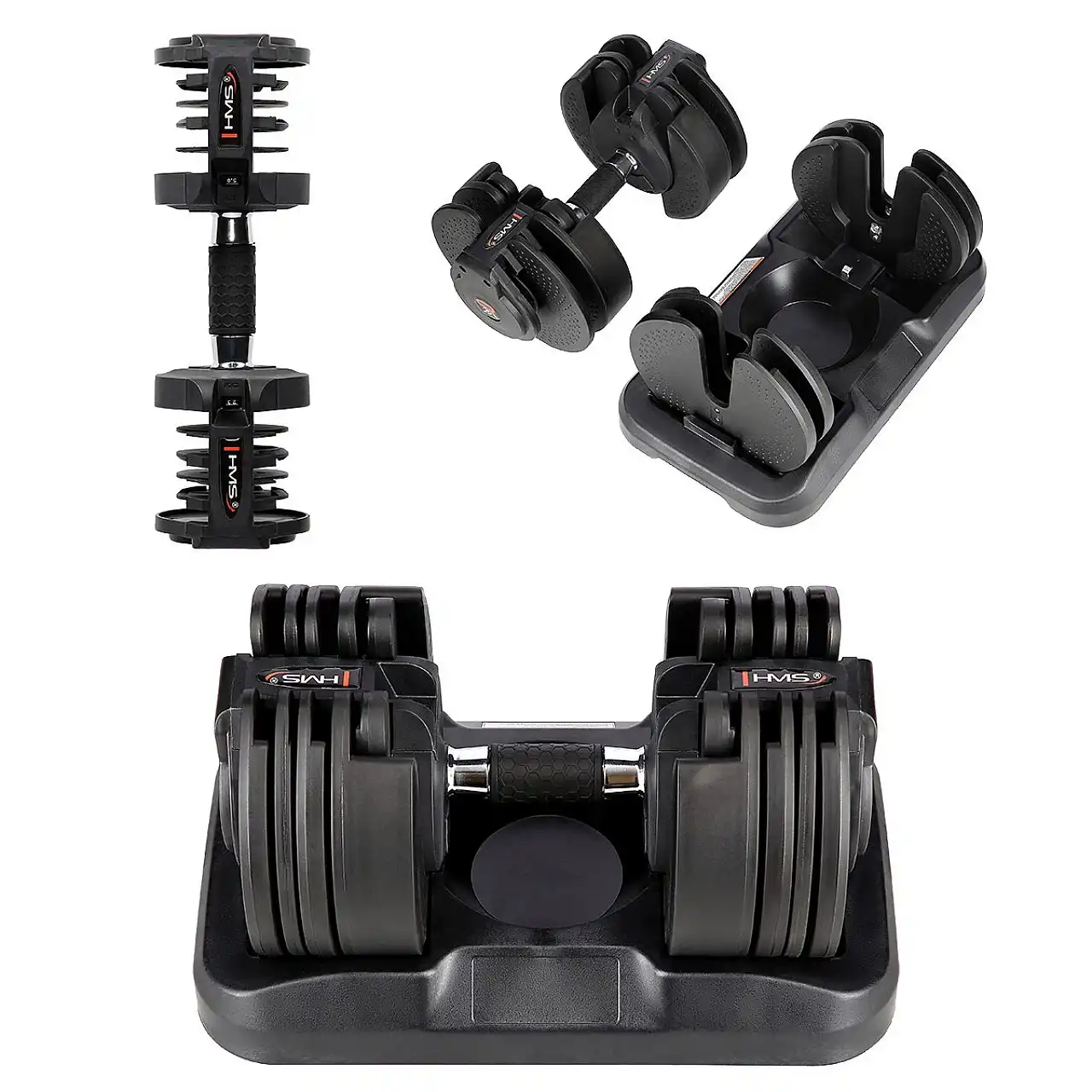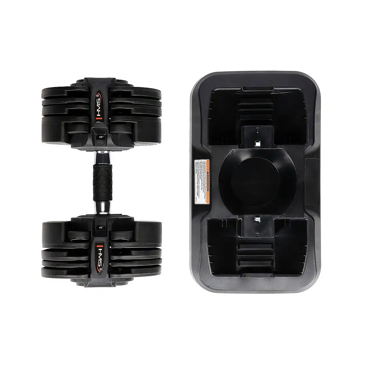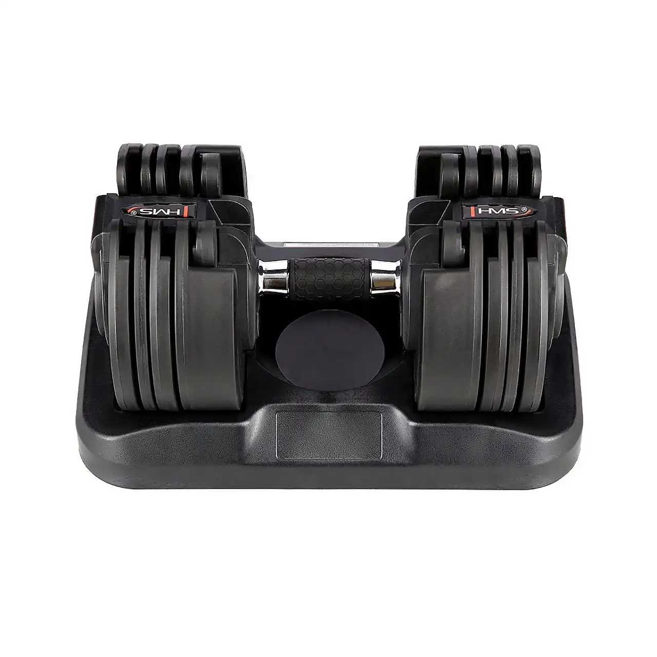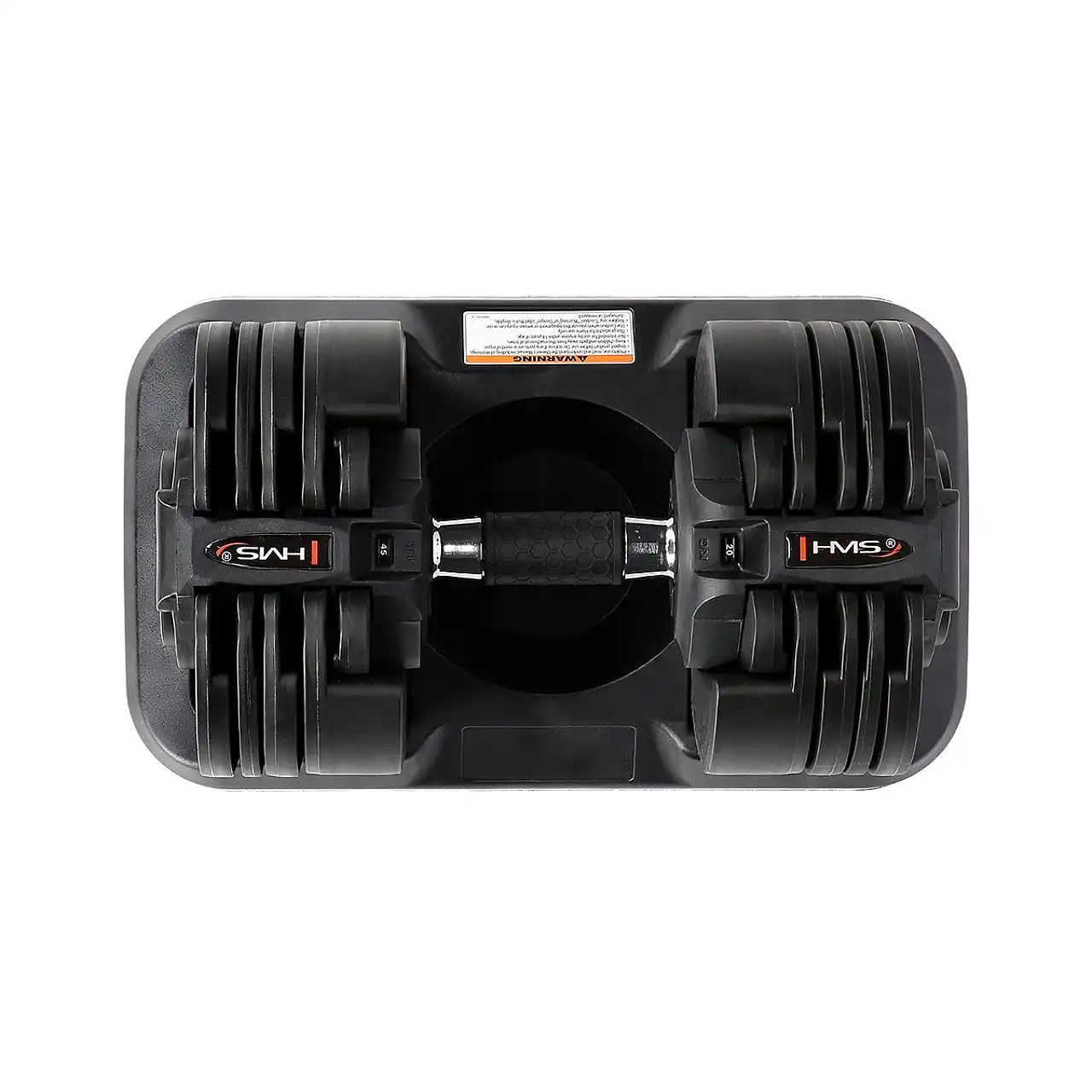 У набір входить гриф, 10 дисків та підставка. Пристрій є ідеальним рішенням для людей, які займаються вдома, але він також добре працюватиме в тренажерному залі, замінюючи великий ряд традиційних гантелей. Інноваційна система кріплення пластини забезпечує дуже швидку і легку заміну навантаження під час тренування. На відміну від традиційних гантелей, для демонтажу та монтажу пластин не потрібно кожного разу відкручувати затискачі та монтувати та демонтувати пластини. Коли мова йде про SR20, просто поставте гантель на підставку і встановіть потрібне навантаження двома ручками. Коли планку знову піднімуть, пластини розташуються на ній відповідно до до бажаного налаштування. Виріб виготовлено з матеріалів найкращої якості. Великою перевагою SR20 HMS є ергономічна рукоятка, покрита протиковзким матеріалом. Регульовані гантелі HMS - це інноваційне рішення для любителів силового спорту - 10 пластин дозволяють користувачеві регулювати навантаження індивідуально, залежно від потреб користувача.