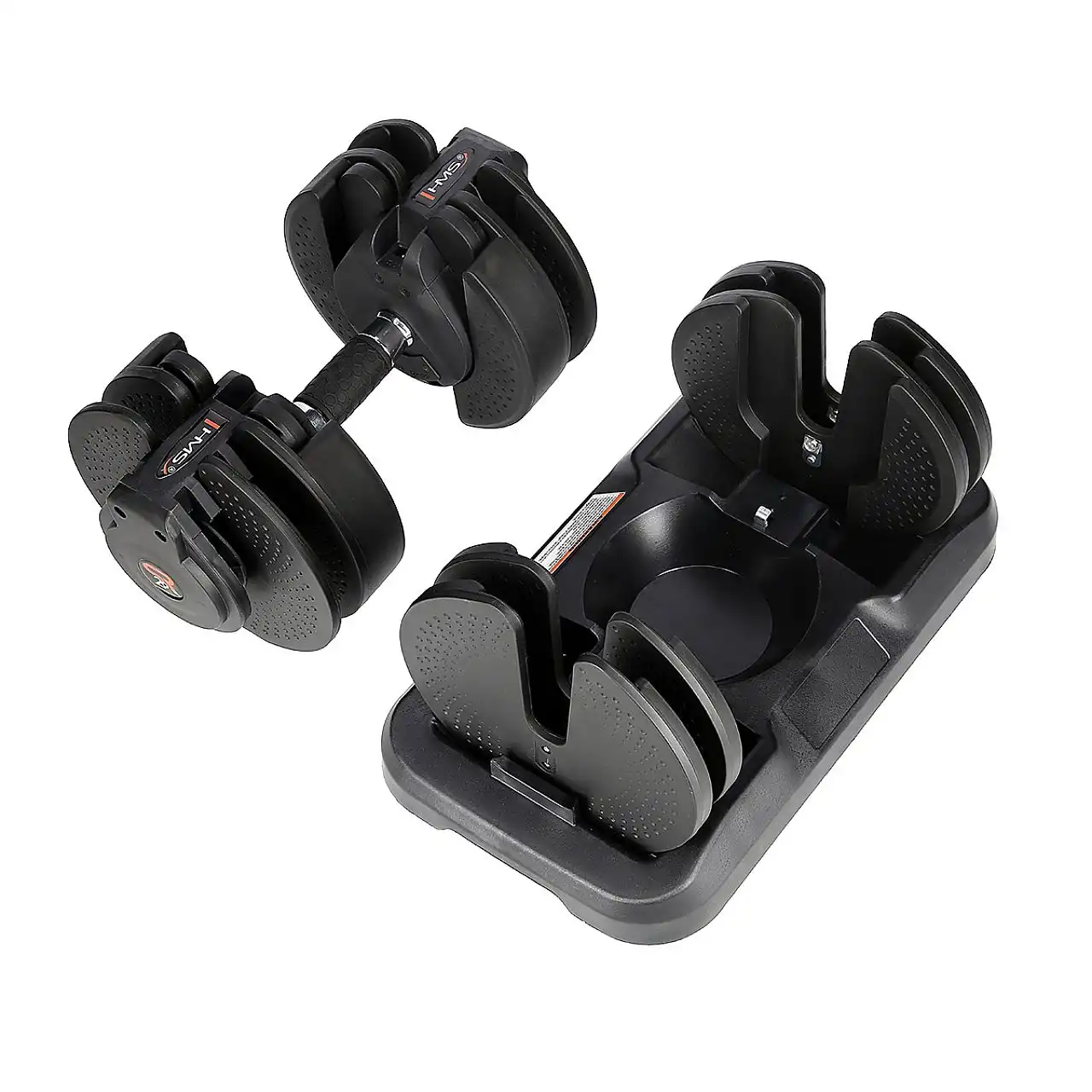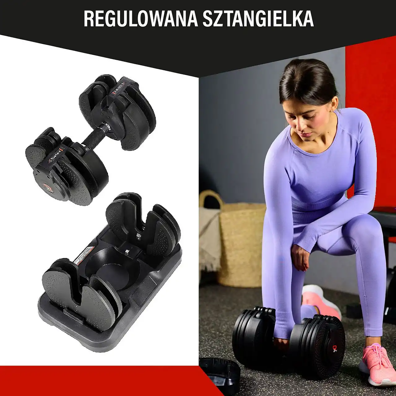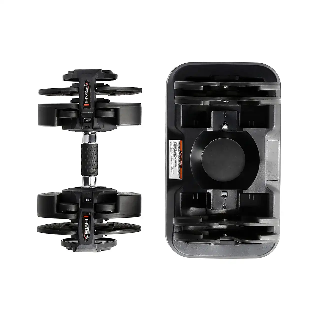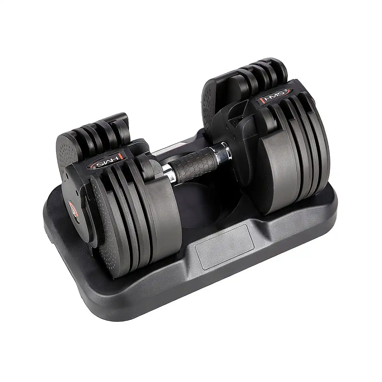 У набір входить гриф, 10 дисків та підставка. Пристрій є ідеальним рішенням для людей, які займаються вдома, але він також добре працюватиме в тренажерному залі, замінюючи великий ряд традиційних гантелей. Інноваційна система кріплення пластини забезпечує дуже швидку і легку заміну навантаження під час тренування. На відміну від традиційних гантелей, для демонтажу та монтажу пластин не потрібно кожного разу відкручувати затискачі та монтувати та демонтувати пластини. Коли мова йде про SR20, просто поставте гантель на підставку і встановіть потрібне навантаження двома ручками. Коли планку знову піднімуть, пластини розташуються на ній відповідно до до бажаного налаштування. Виріб виготовлено з матеріалів найкращої якості. Великою перевагою SR20 HMS є ергономічна рукоятка, покрита протиковзким матеріалом. Регульовані гантелі HMS - це інноваційне рішення для любителів силового спорту - 10 пластин дозволяють користувачеві регулювати навантаження індивідуально, залежно від потреб користувача.