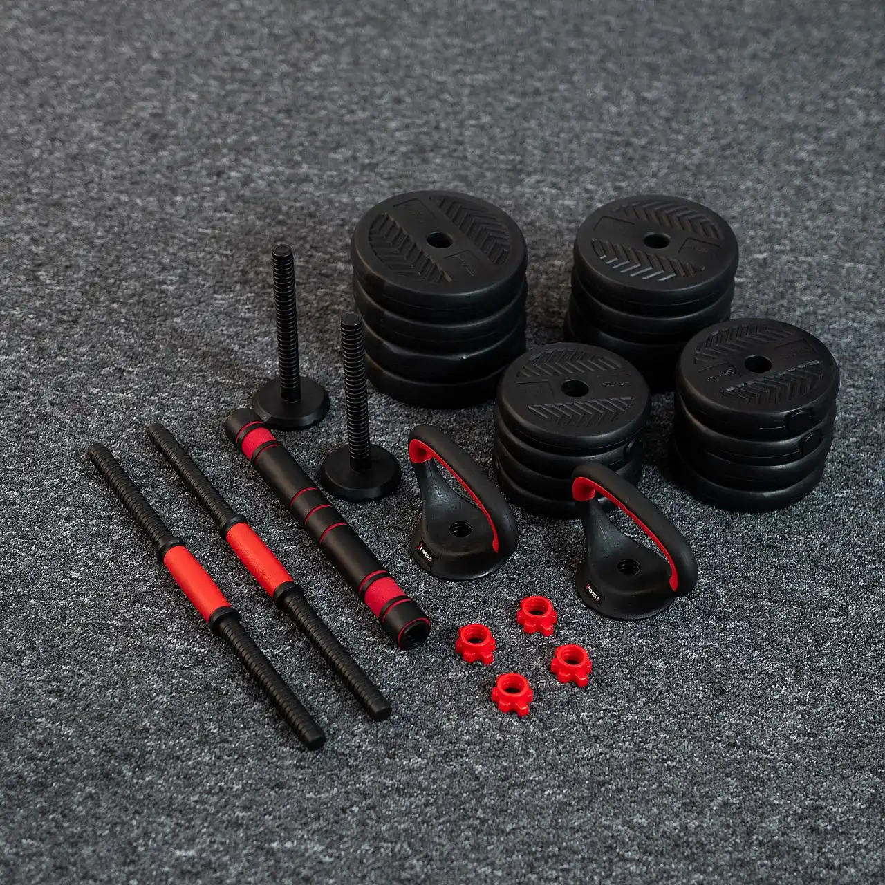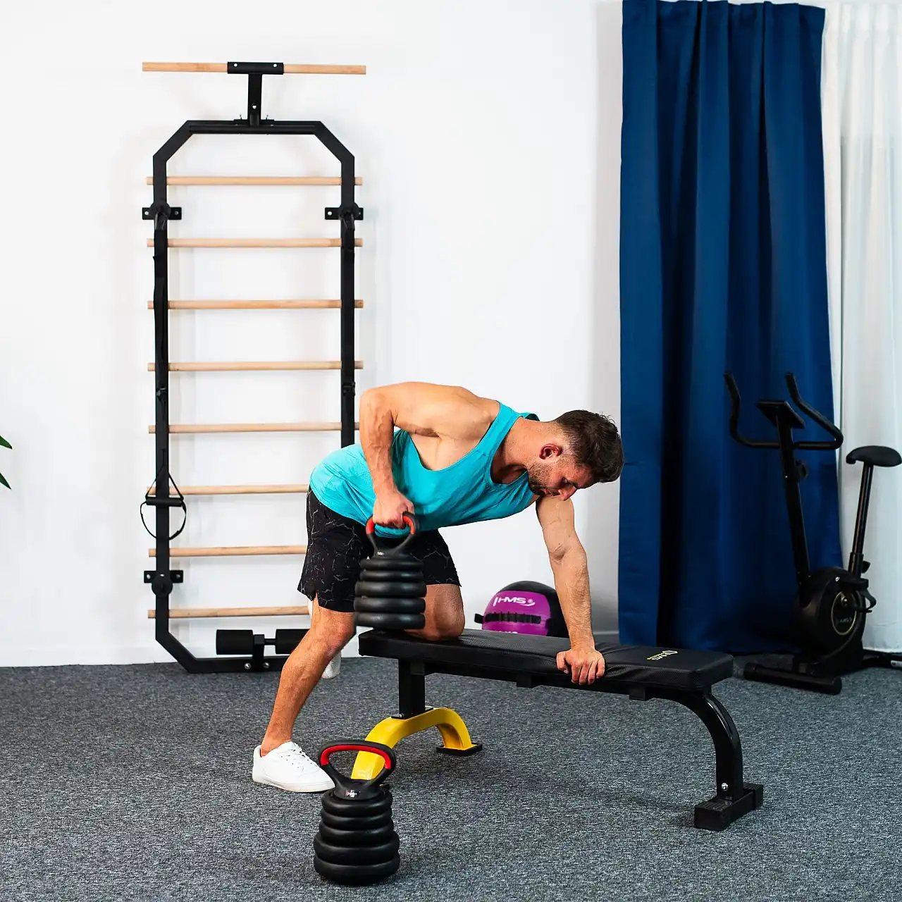 Штанга : з’єднайте дві штанги за допомогою подовжувача, відрегулюйте навантаження та насолоджуйтесь тренуванням. Штанга дозволяє виконувати багатосуглобові вправи, такі як присідання, жими, станова тяга і прибирання. Ці вправи одночасно залучають кілька груп м’язів і покращують координацію, силу, витривалість і м’язову масу.