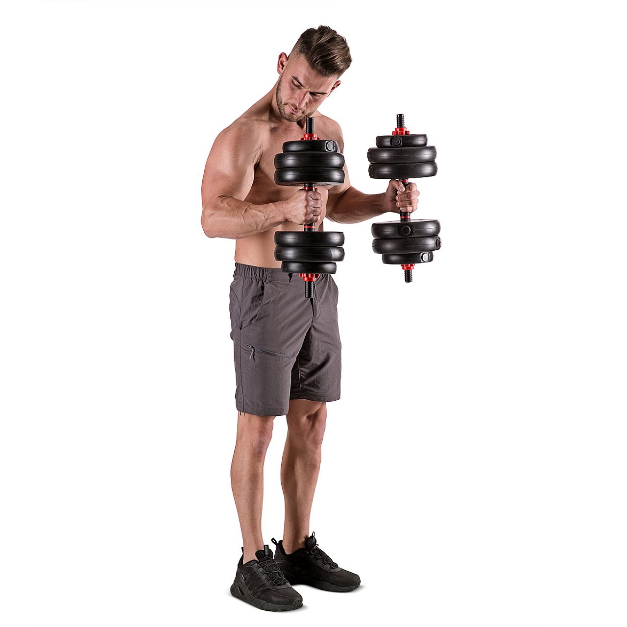 Ми будемо використовувати гантелі для виконання вправ із залученням різних груп м’язів. Їх перевагою є елемент нестабільності. Виконуючи вправу, ми задіємо багато стабілізуючих м'язів, що робить тренування більш ефективним. Вони мають різьбовий вантажний рукав, діаметр якого ідеально відповідає діаметру отвору вагових пластин, тому змінювати вантаж дуже легко. Стійке положення тарілок на грифах забезпечують зірчасті затискачі, які легко нагвинчуються на гриф.