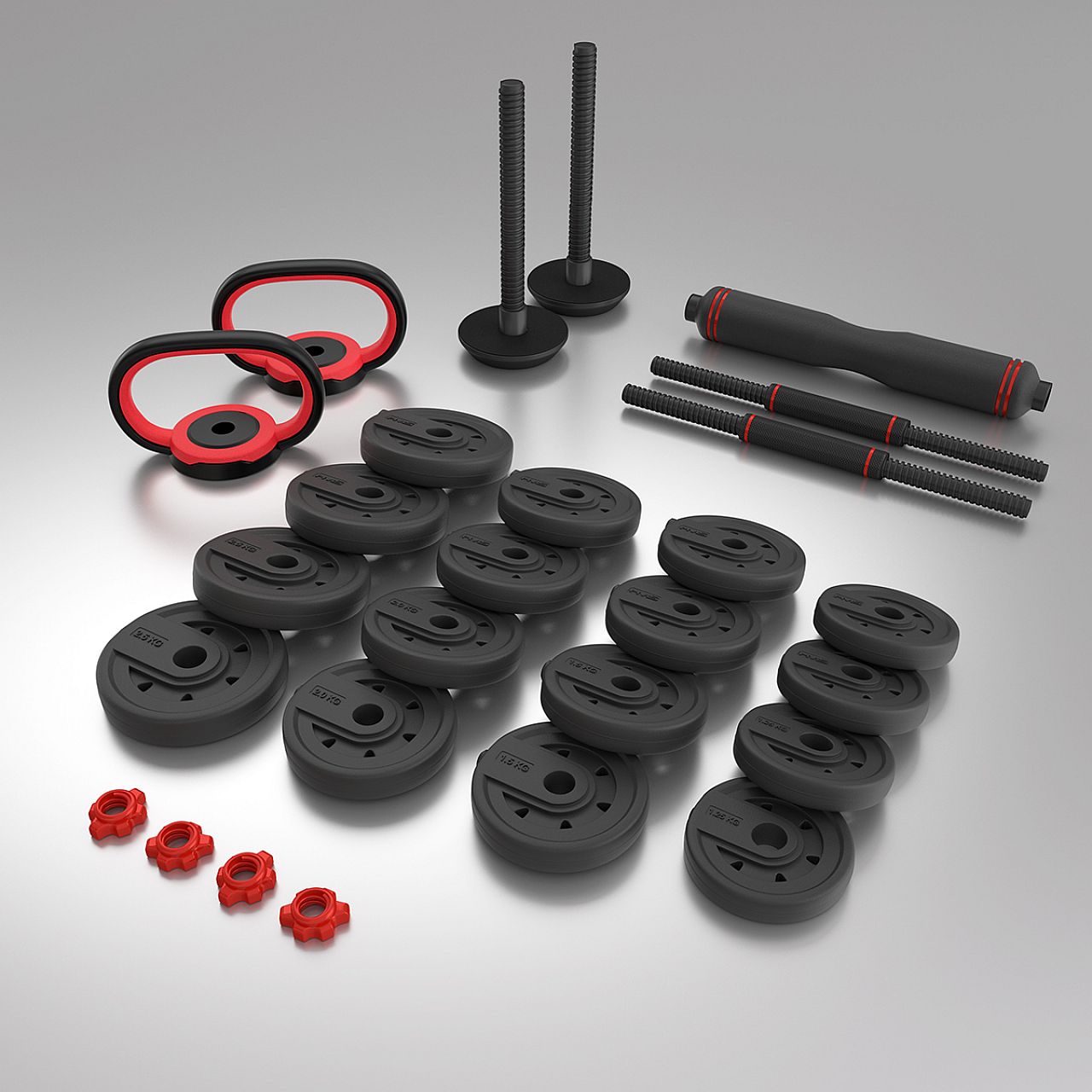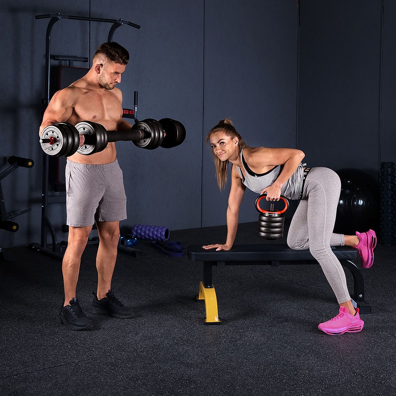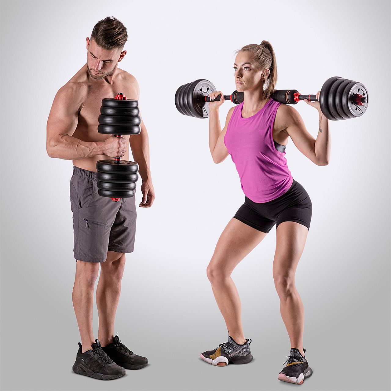 Самі гантелі надають багато можливостей для виконання вправ, але всі елементи, що входять до цього набору, роблять вибір вправ для виконання невичерпним. Набір 6 в 1 дозволяє виконувати вправи для всіх груп м'язів і маневрувати ними таким чином, щоб уникнути монотонності і застою м'язів.