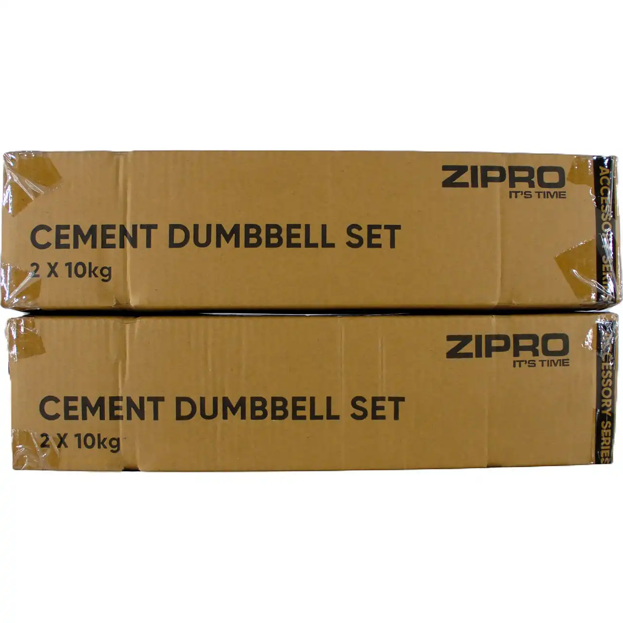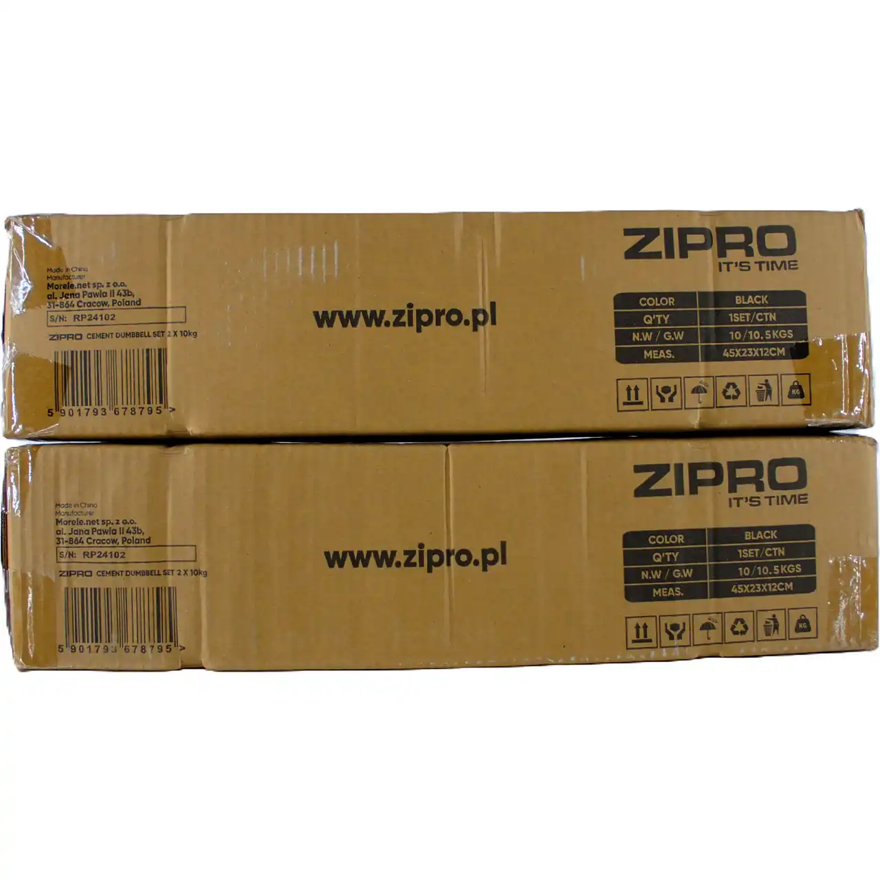Гантелі Zipro складаються з двох коротких сталевих стрижнів, кожен завдовжки 40 см, та гир загальною вагою 20 кг. Пластини виготовлені з цементу з пластиковим покриттям, яке захищає підлогу у разі падіння та повернення на місце після сету.