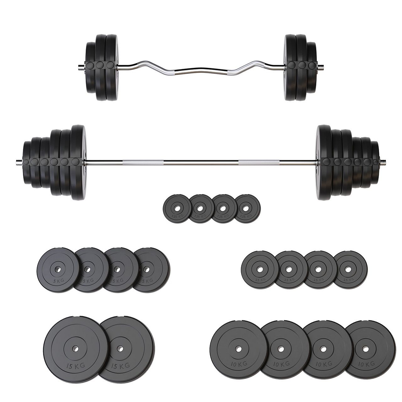 Диски з міцним ABS-покриттям надійно захищають підлогу від подряпин і зменшують шум під час тренувань. Хромовані сталеві грифи з рифленими ручками забезпечують впевнений хват і комфорт навіть під час інтенсивних занять.
