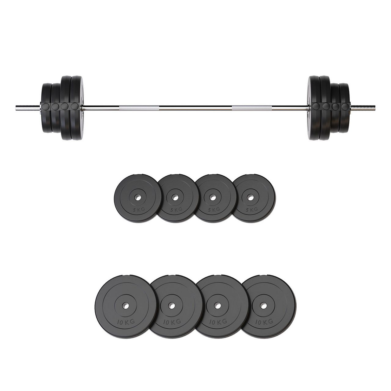 Диски з міцним ABS-покриттям надійно захищають підлогу від подряпин і зменшують шум під час тренувань. Хромовані сталеві грифи з рифленими ручками забезпечують впевнений хват і комфорт навіть під час інтенсивних занять.